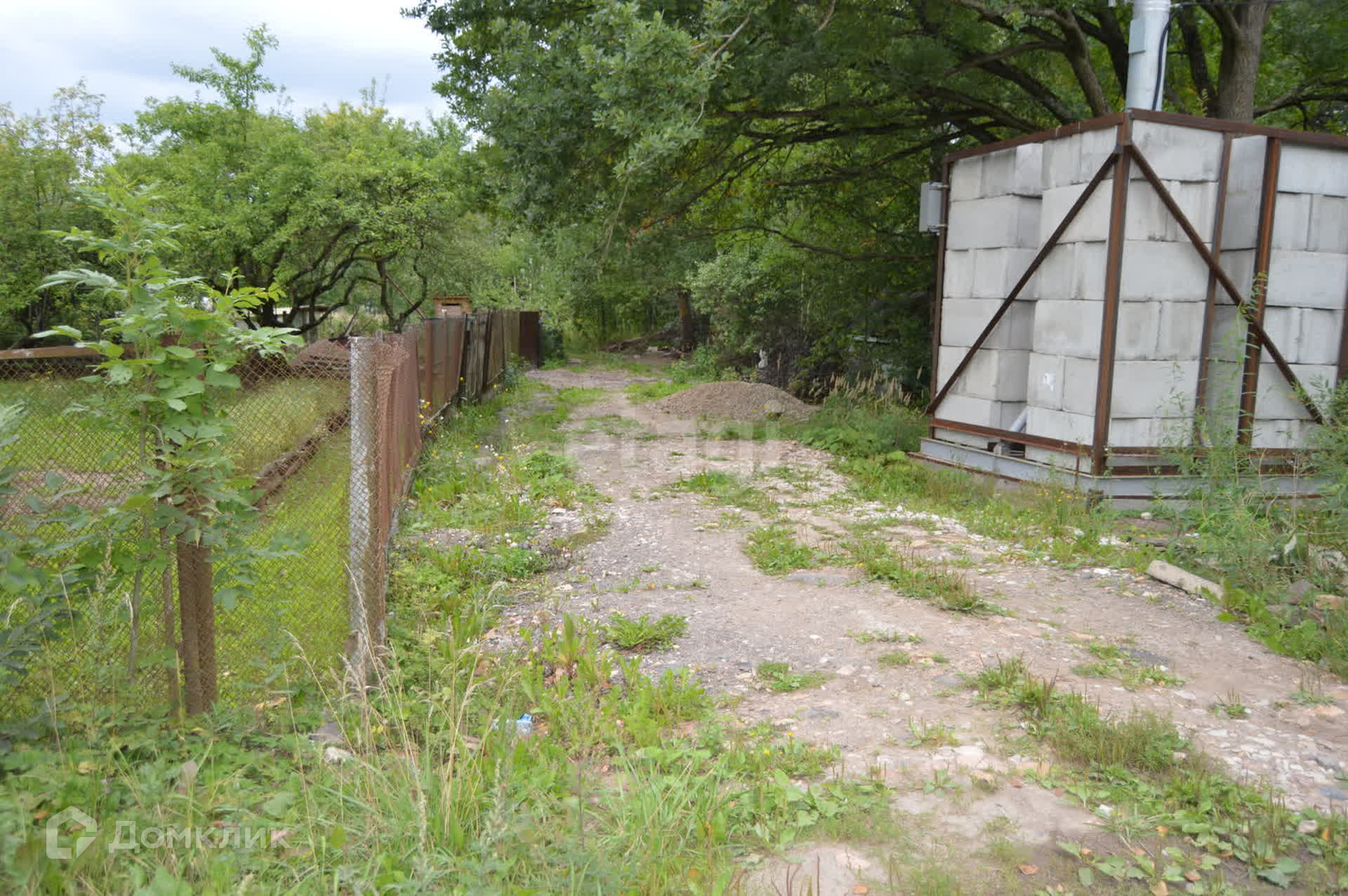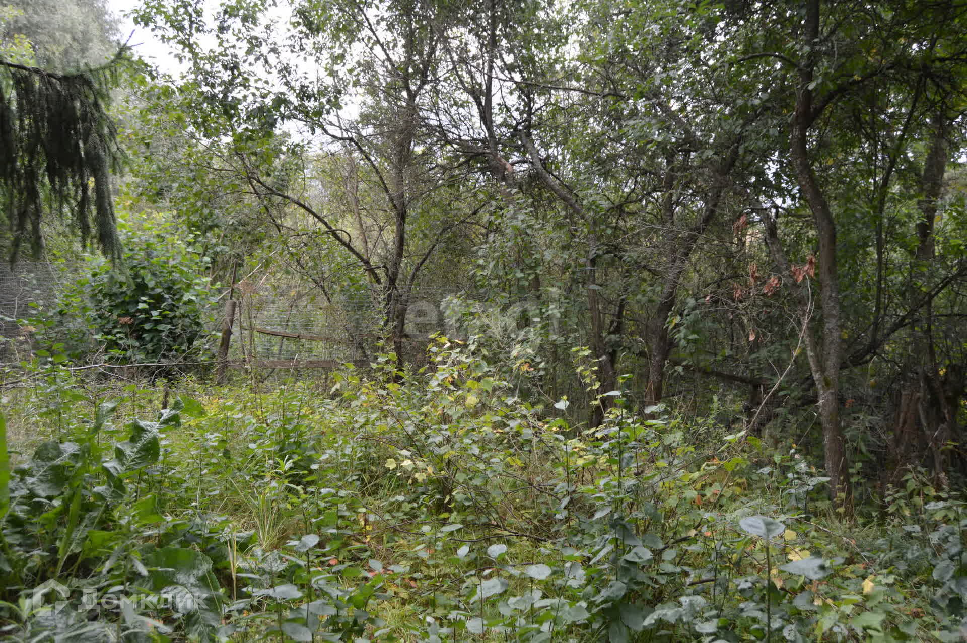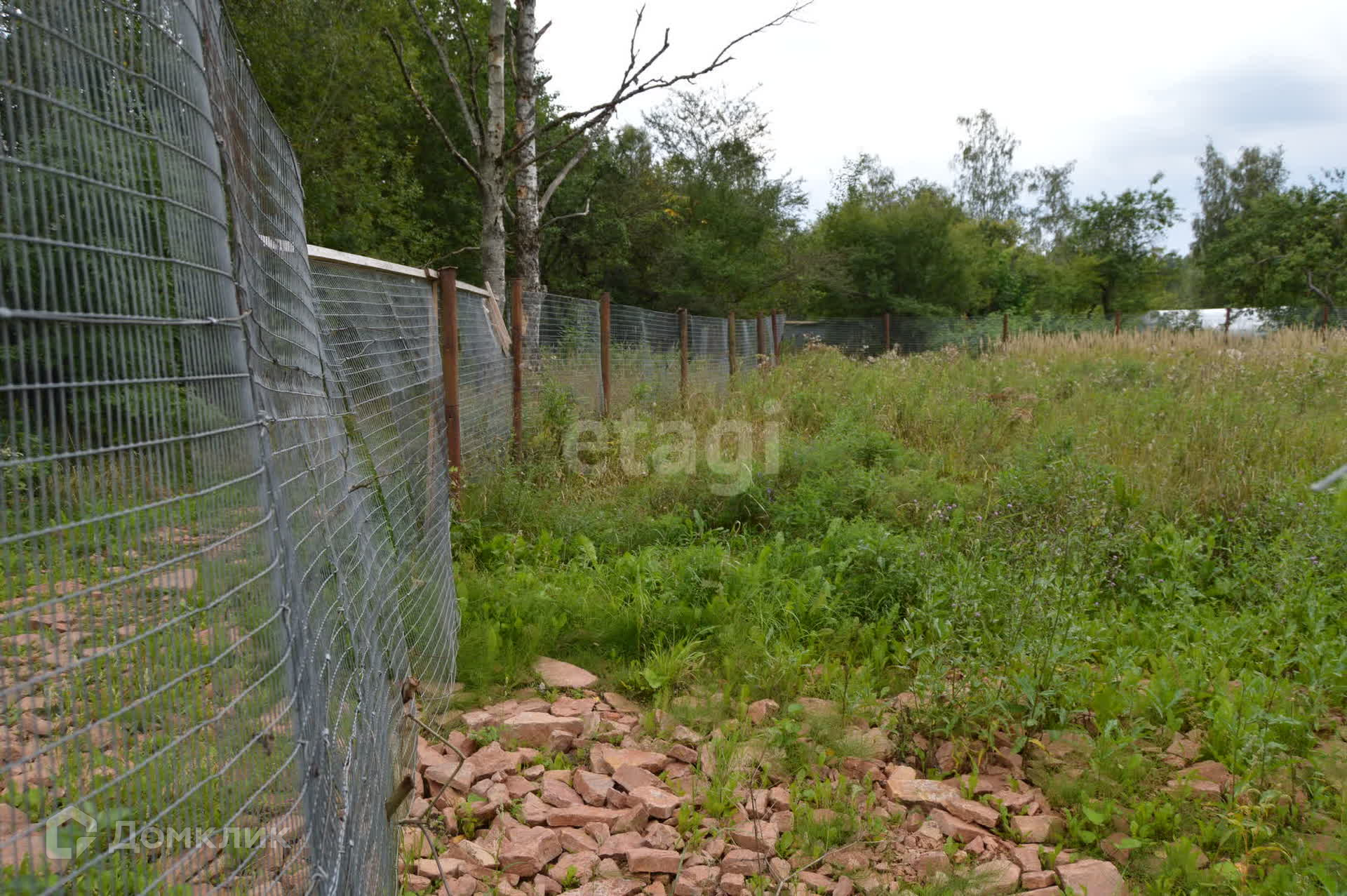 Огражден сеткой рабицей с трех сторон, имеются насаждения деревьев.