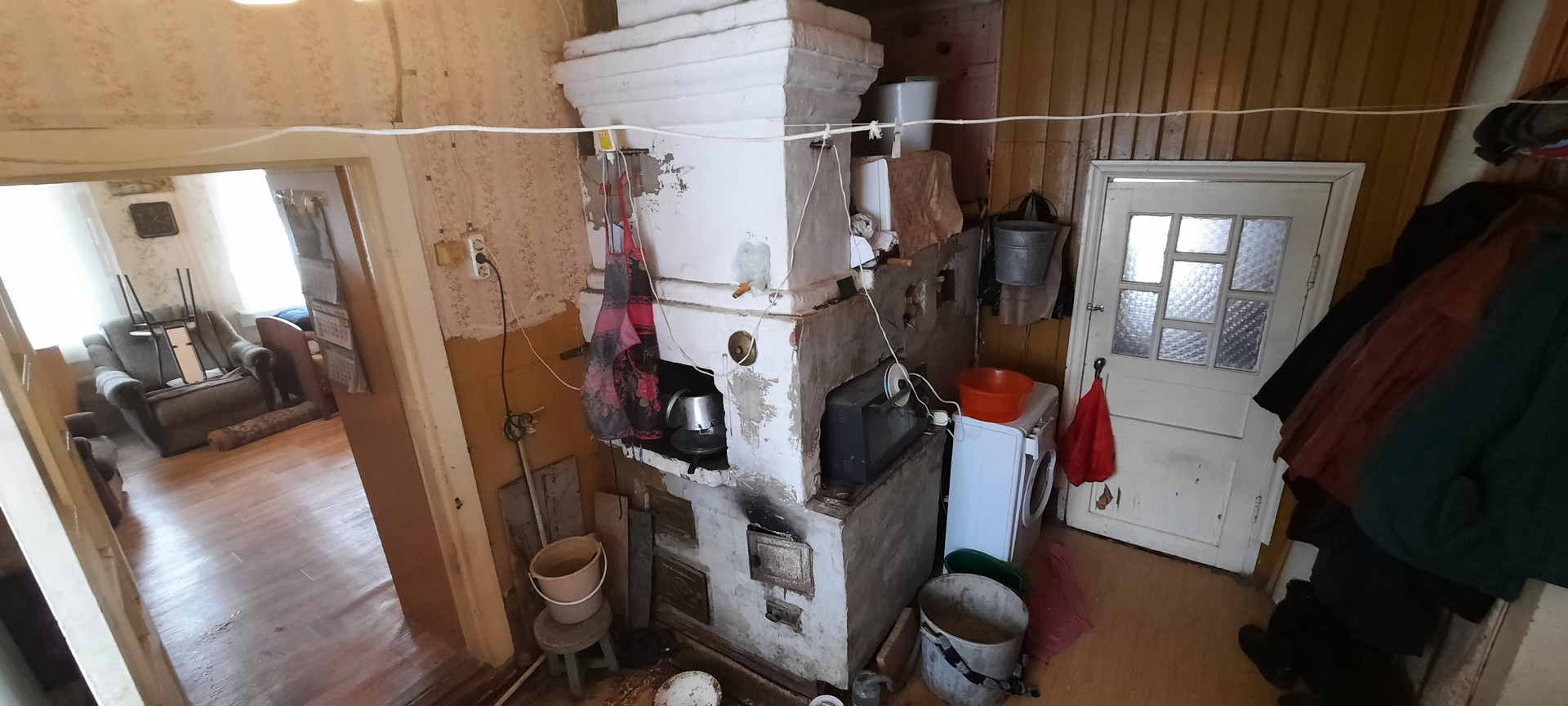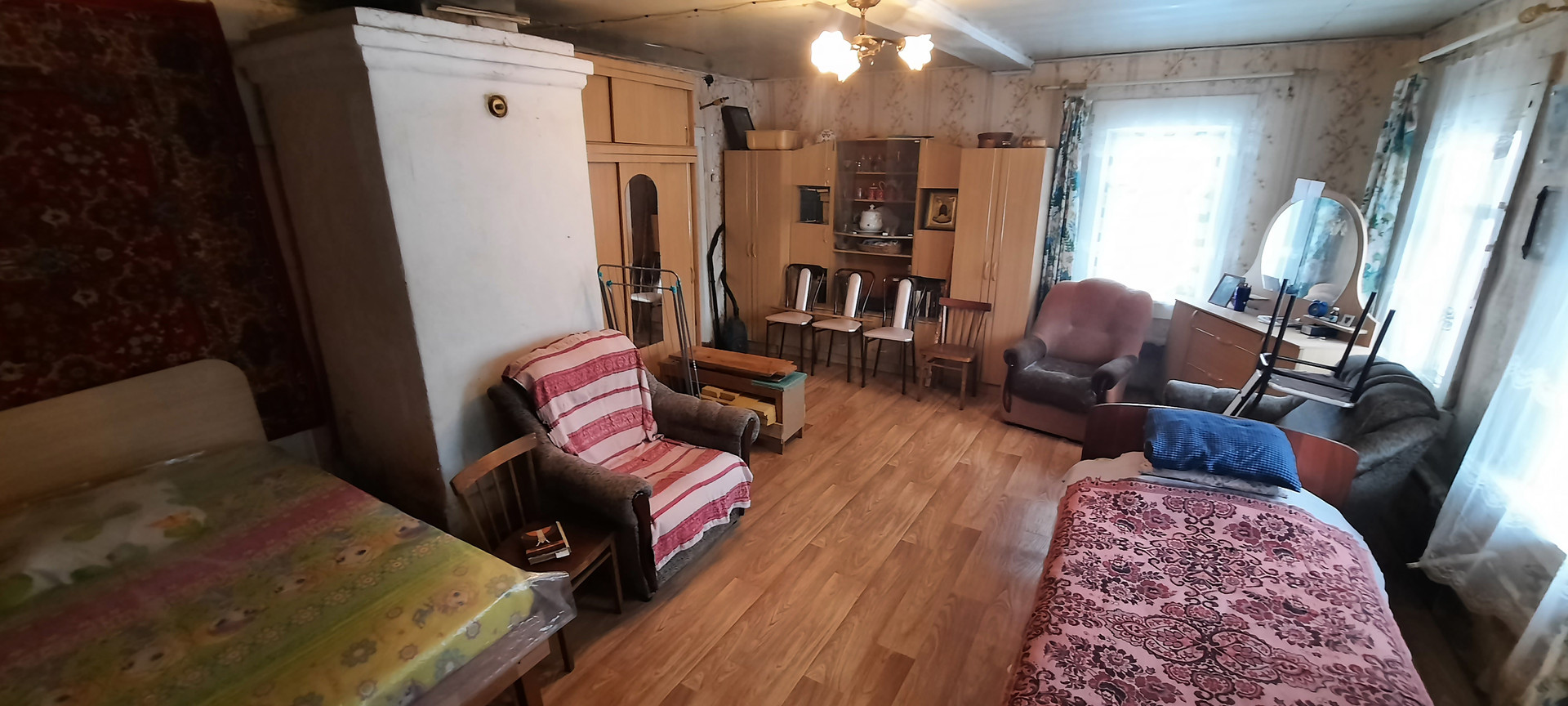 В Центральной комнате 30,3 кв. м стоит русская печь, полностью функционирует. Есть вариант убрать печь и выполнить перепланировку, чтобы увеличить жилую площадь. Можно все пространство разделить на отдельные комнаты и получится неплохая трехкомнатная «квартира».