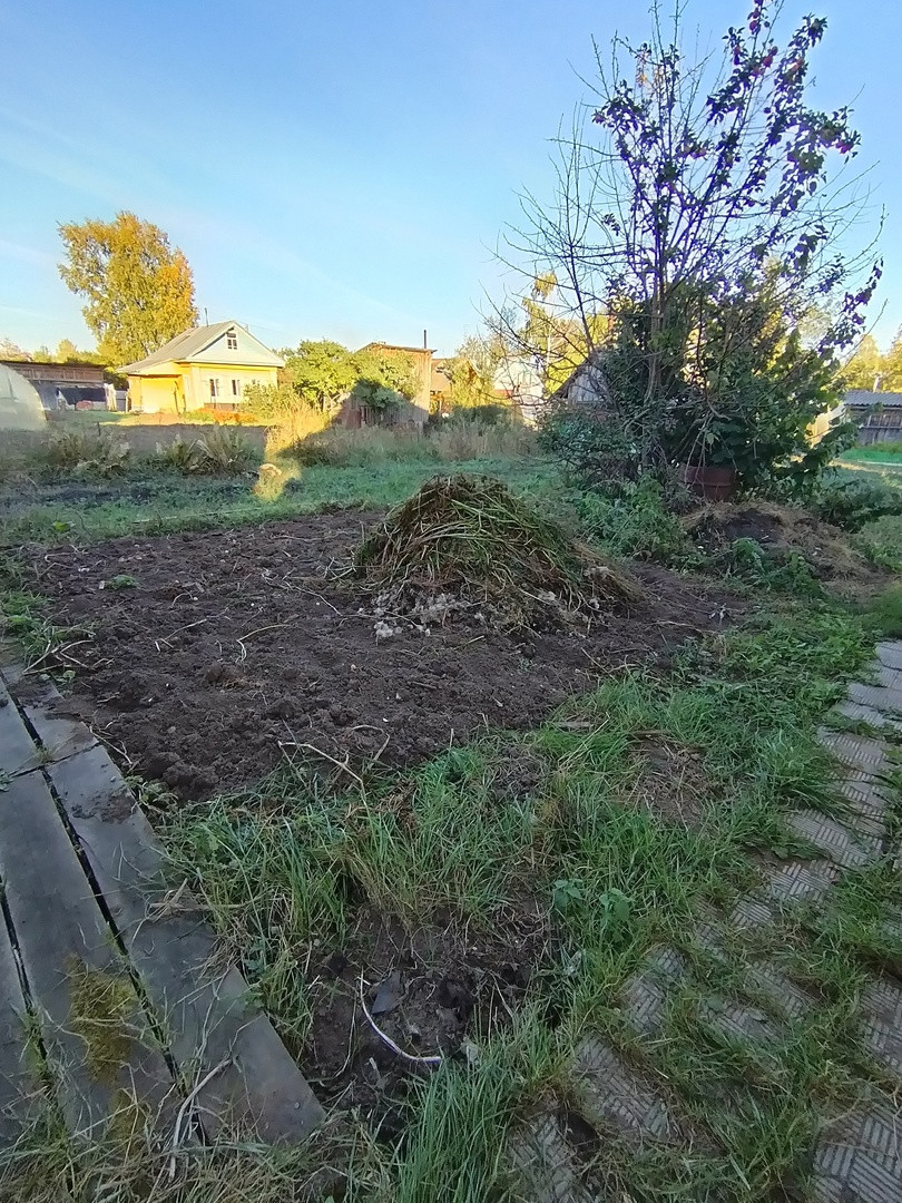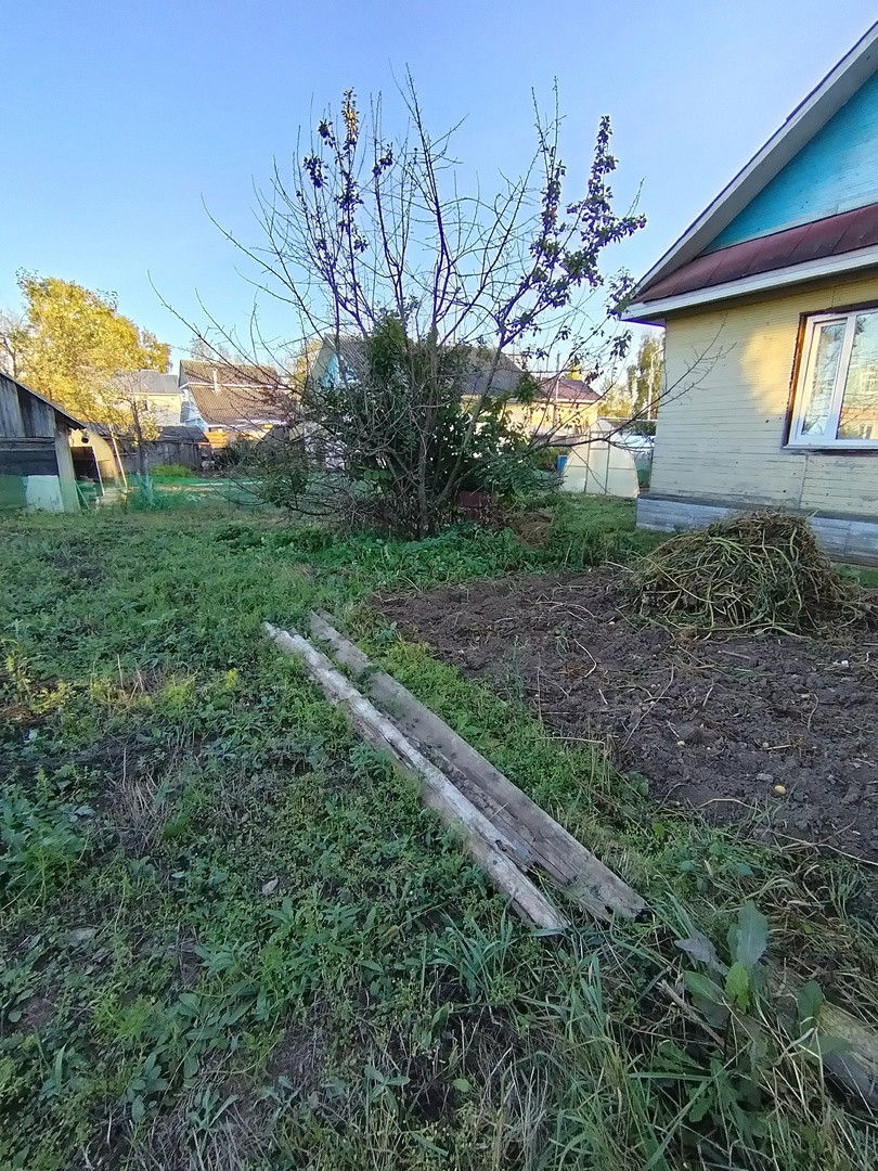 Участок разработан, есть теплица, 2 плодоносящие яблони.