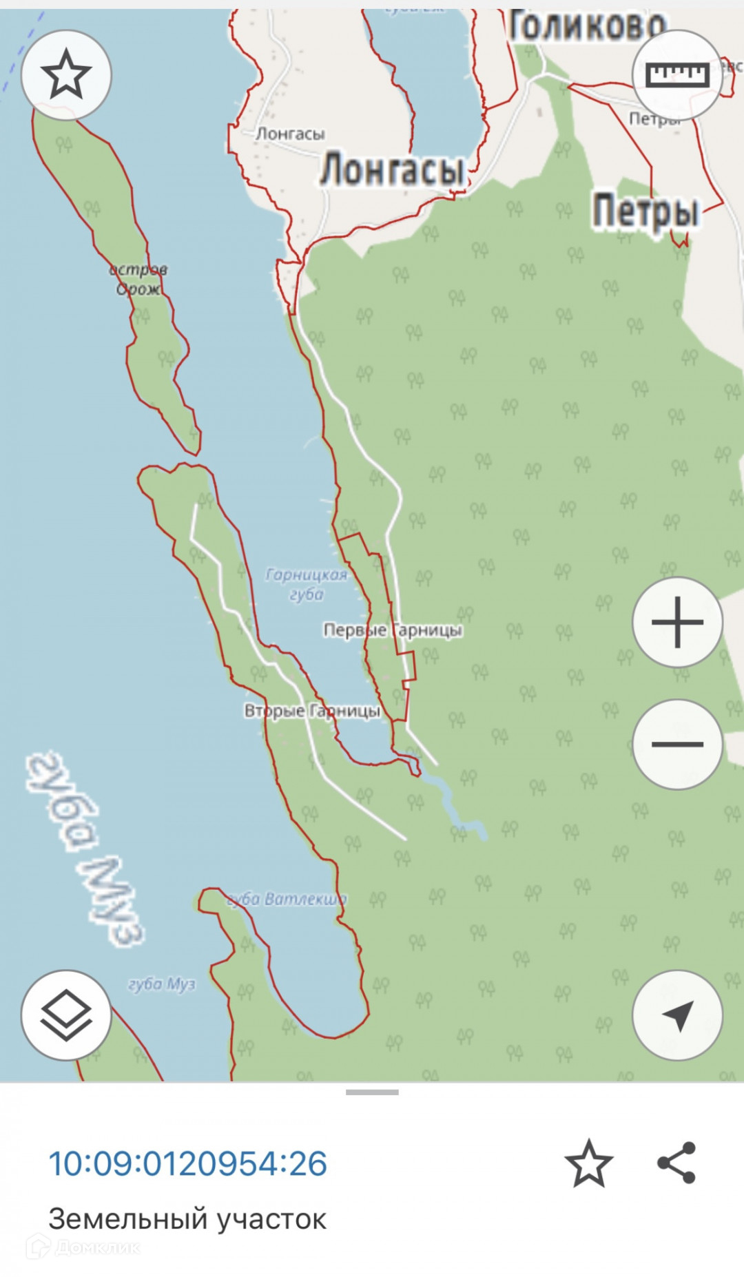 Площадь участка 15 соток, вторая береговая линия, участок правильной прямоугольной формы. Расположен на острове Большой Клименецкий (Онежское Озеро), в старинной карельской деревне  Первые Гарницы. Отличное, тихое место с красивой природой и своей историей. Подойдет для постройки своего дома, бани или для организации гостевого дома для туристов, которые хотят увидеть настоящую Карелию. Остров относится к архипелагу кижских шхер, до острова Кижи 10 км по воде, до Петрозаводска 50 км.