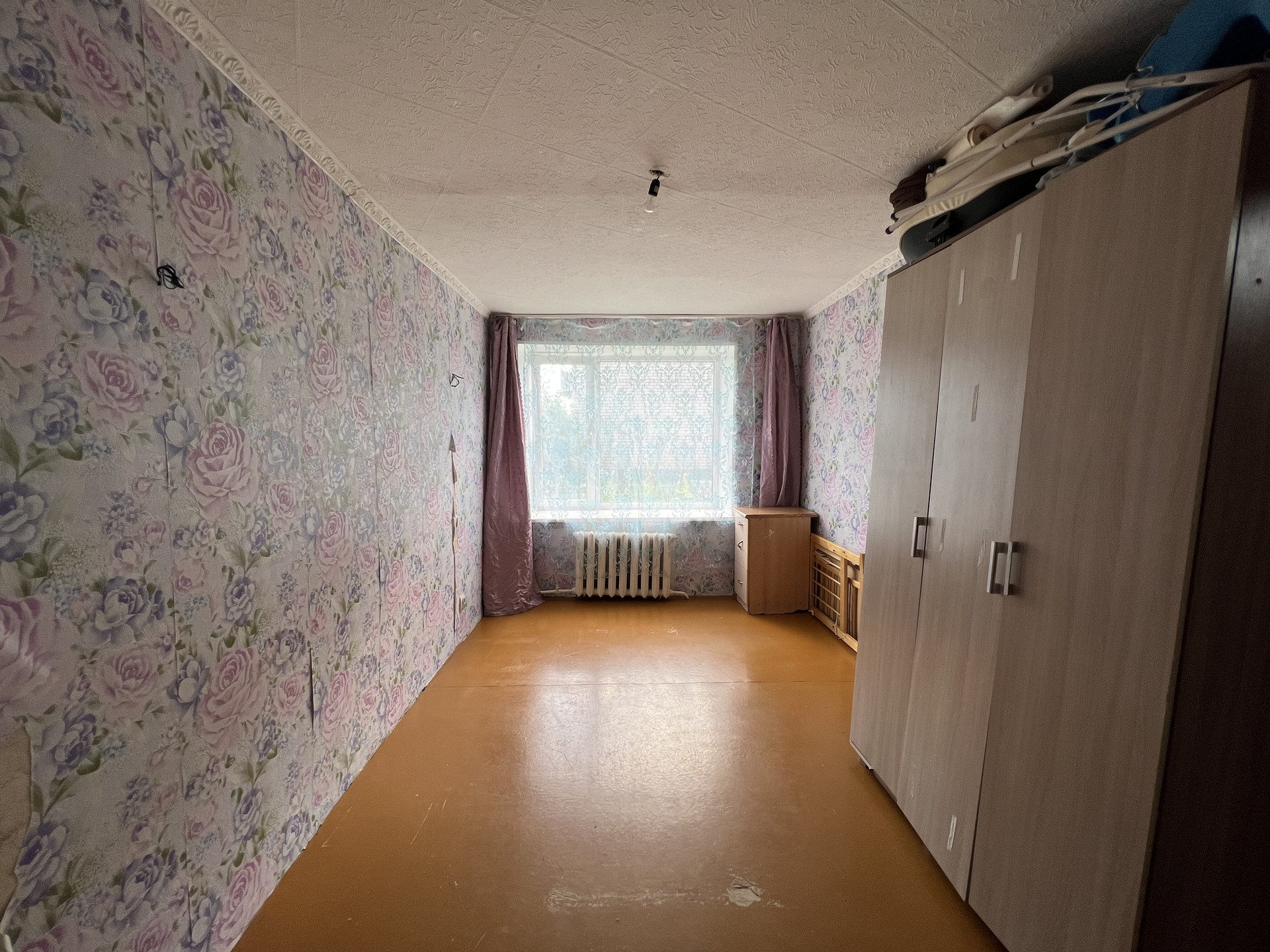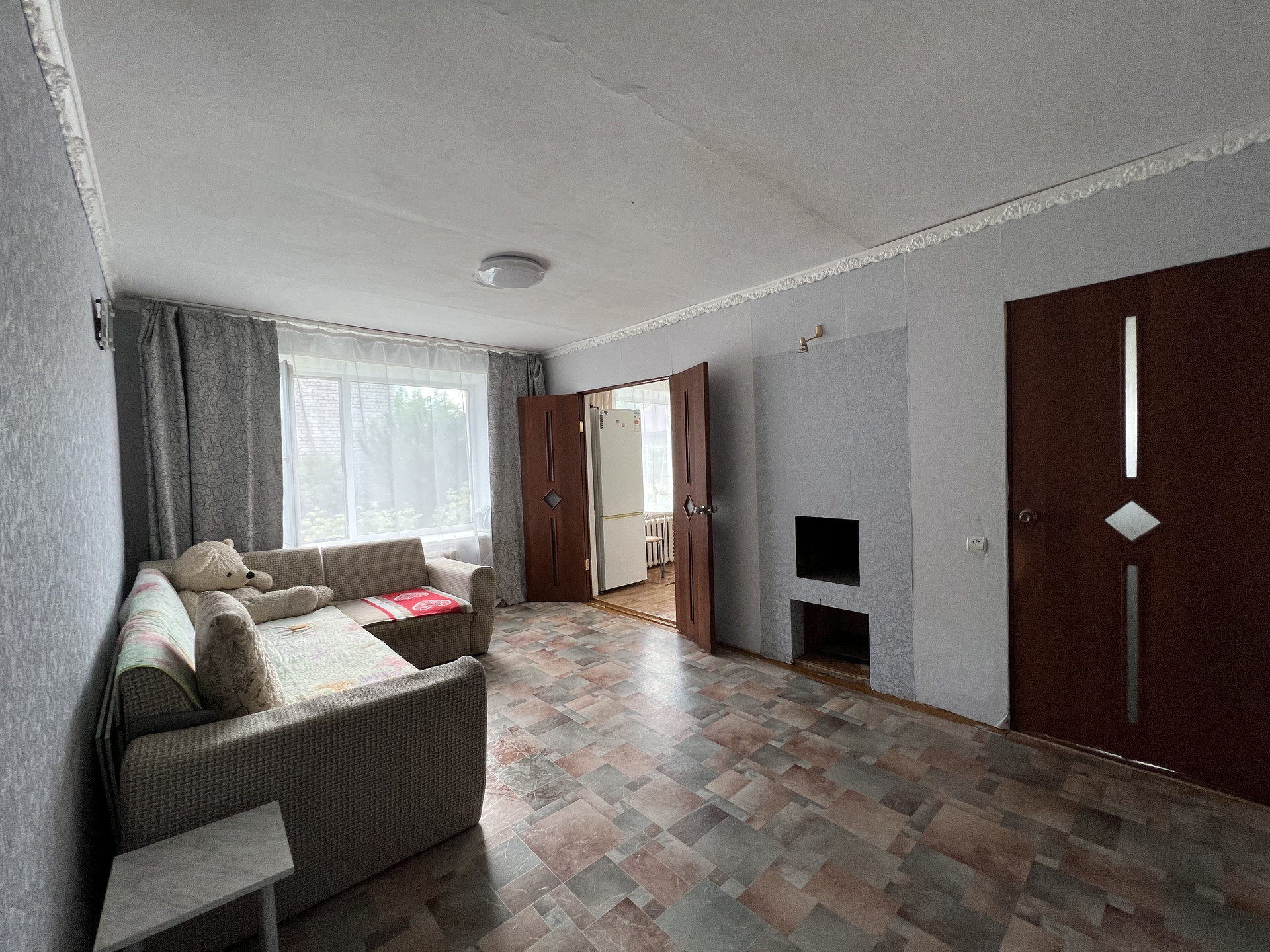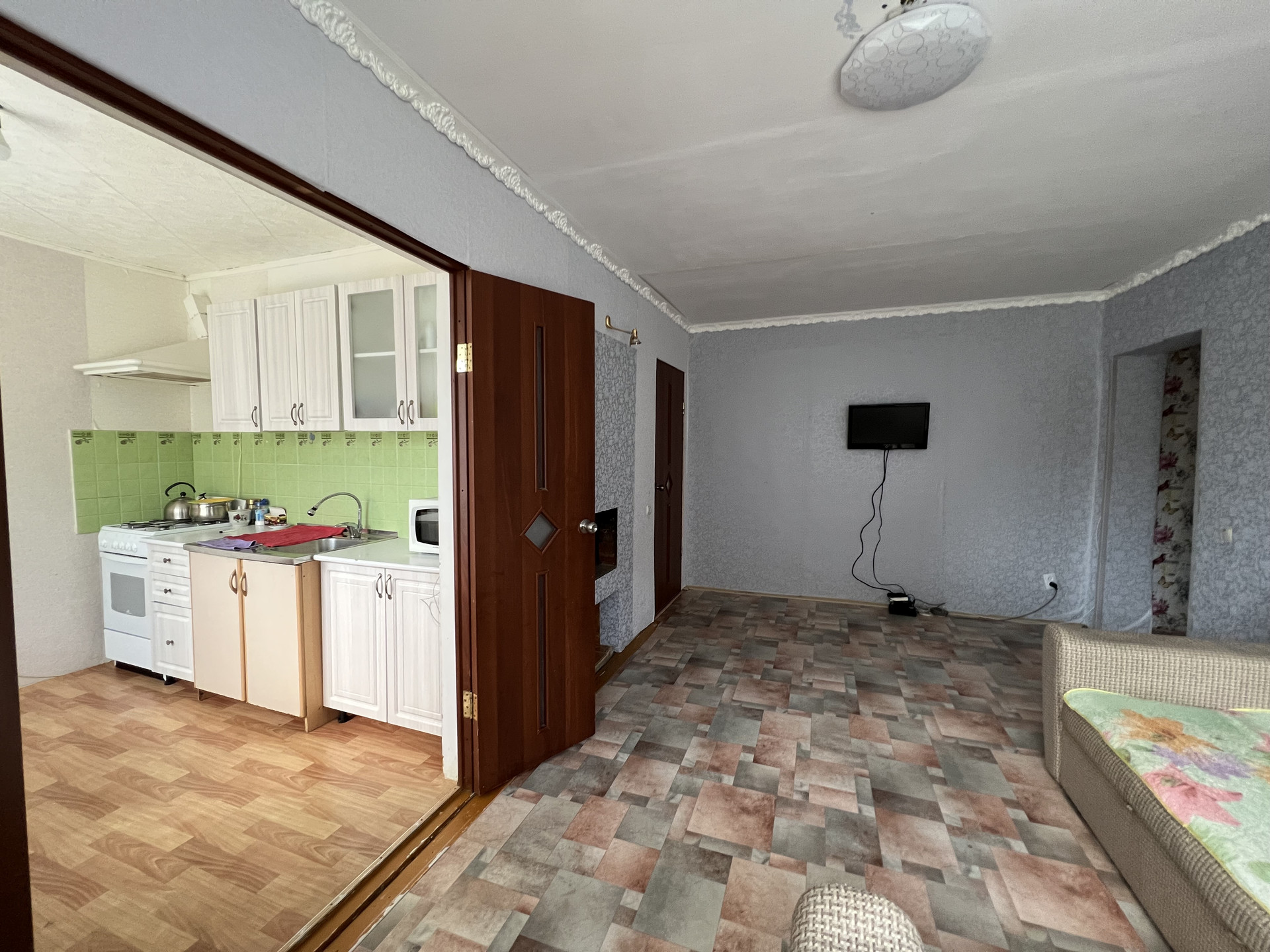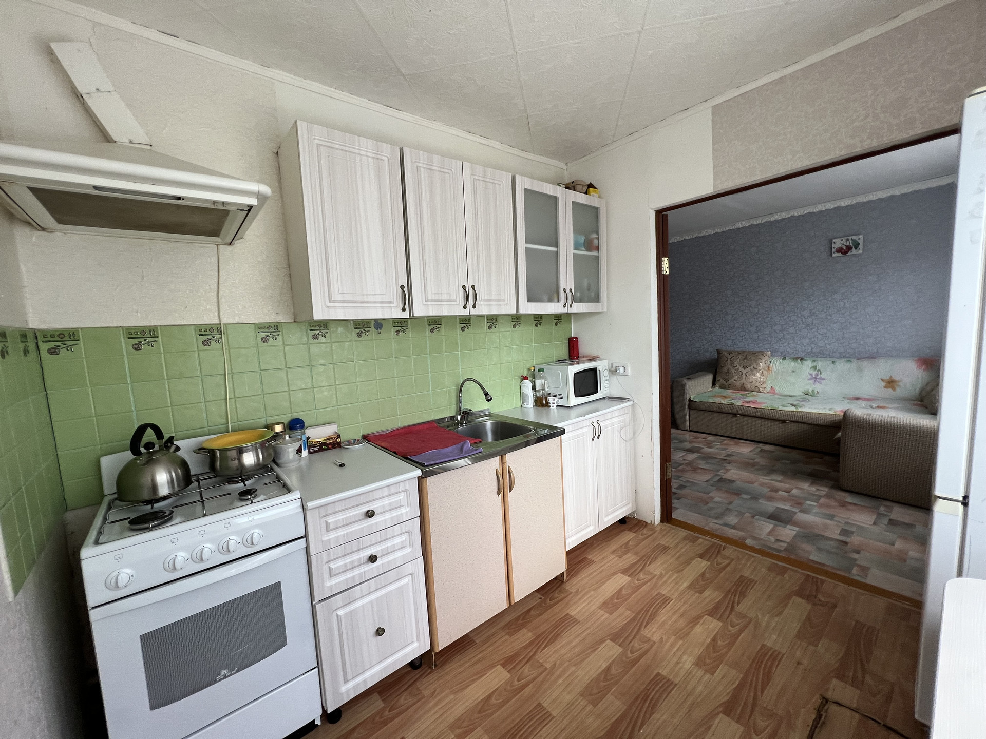 В квартире сделан частично ремонт, поставлены стеклопакеты, на полу линолеум, в санузле плитка, есть газ привозной, кухонный гарнитур оставим, шкаф.