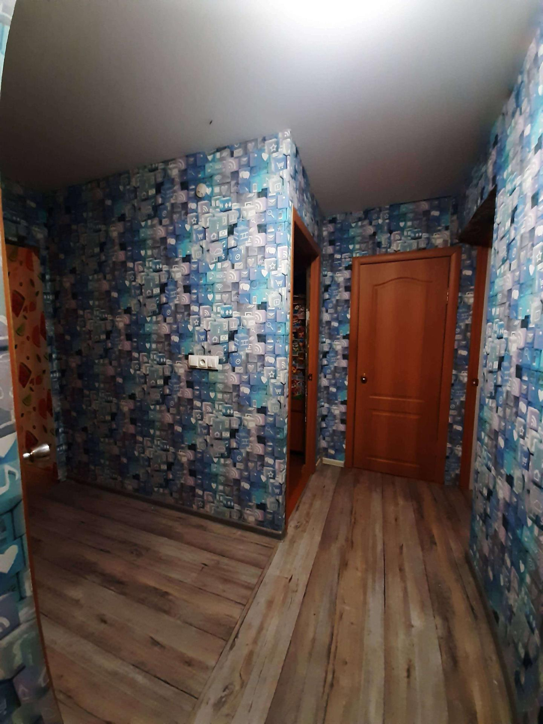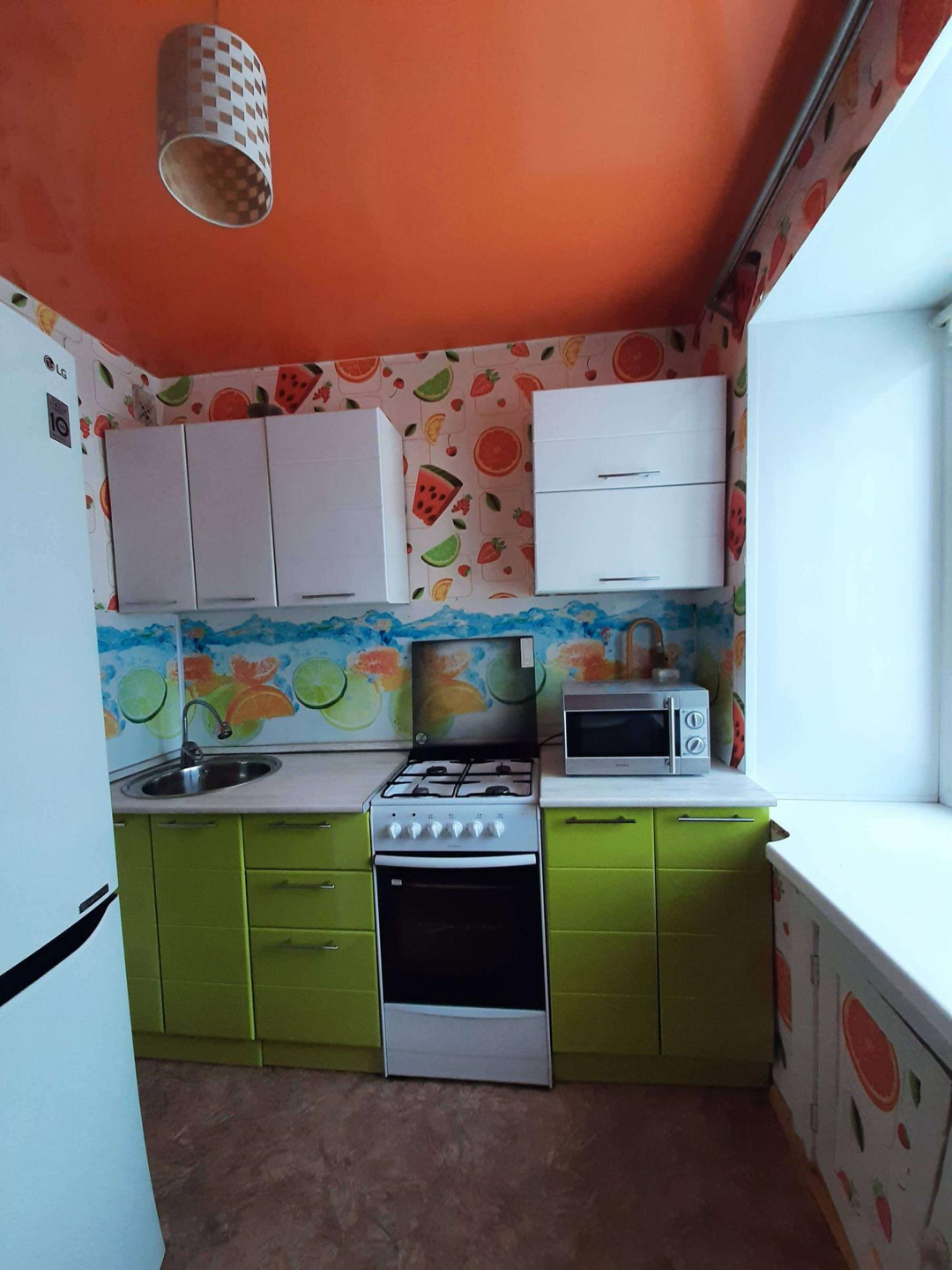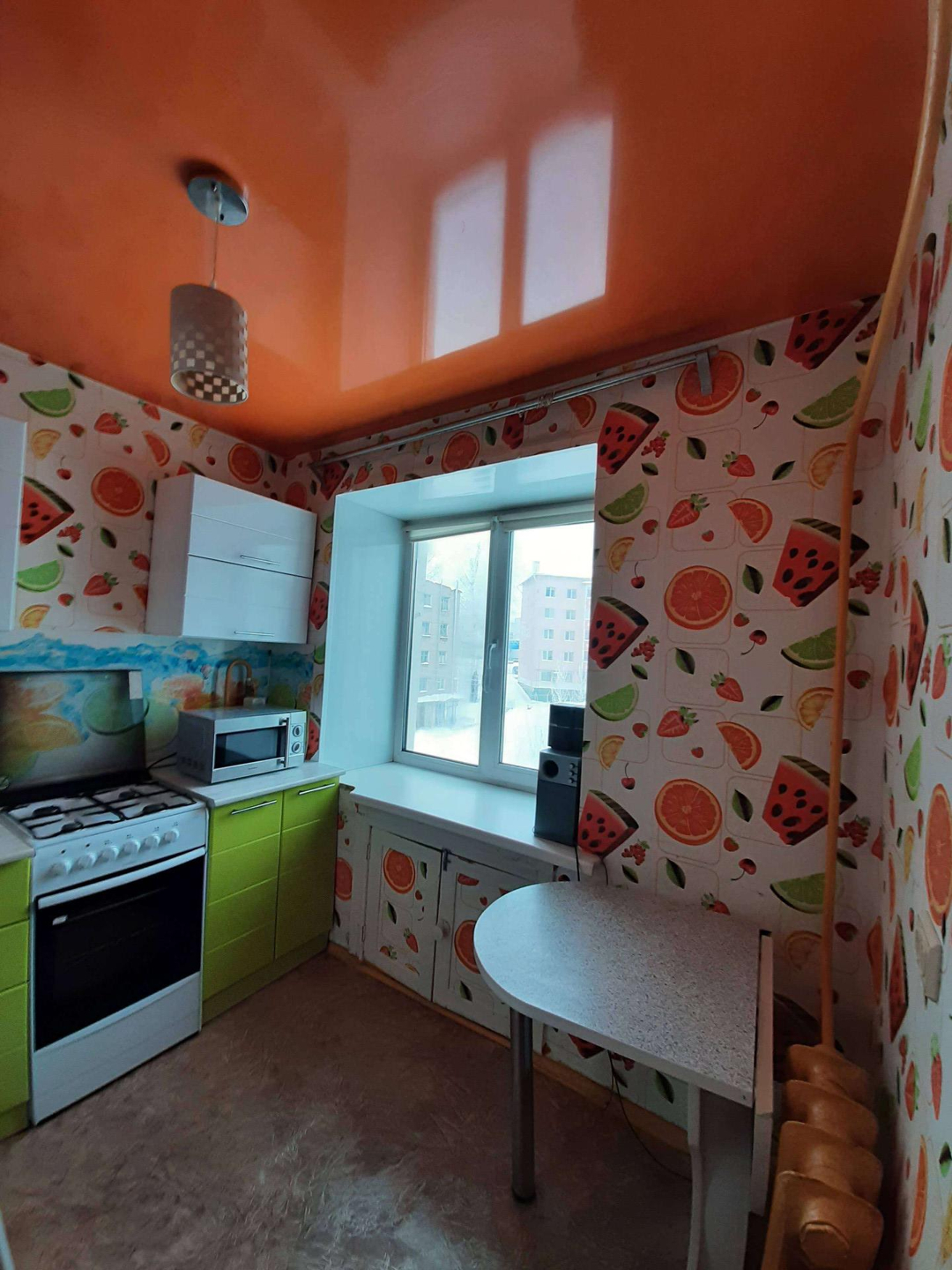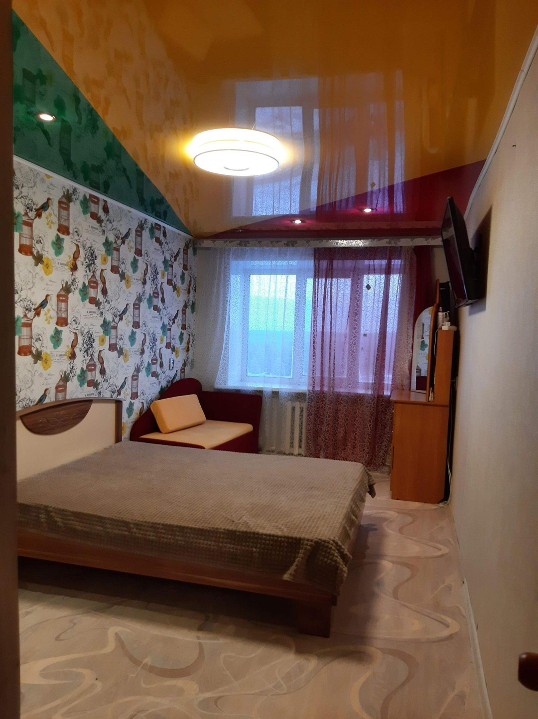 Тёплая уютная квартира. Натяжные потолки, на полу линолеум. Окна - стеклопакеты, балкон застеклён. Городской парк в 2 минутах от дома.