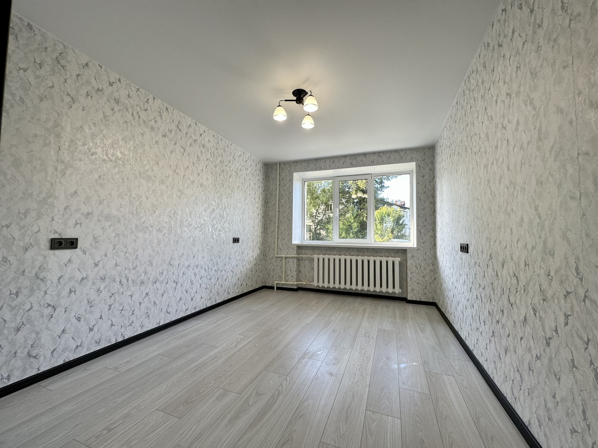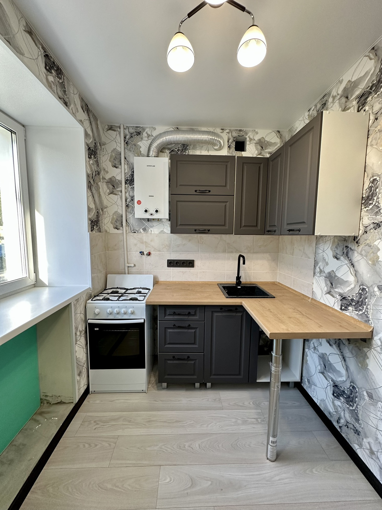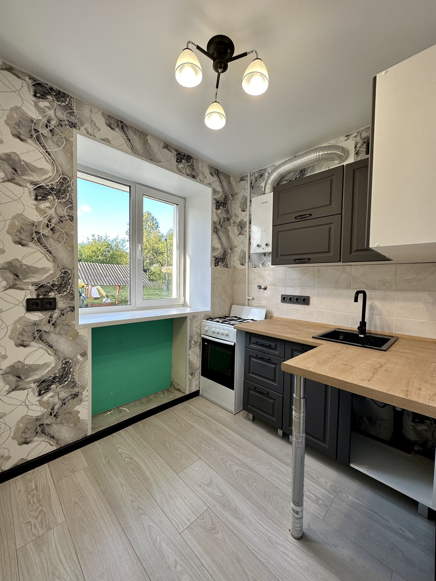 В квартире выполнен ремонт: Выровнены стены, на полу - ламинат, в санузле плитка, заменена проводка, новая входная дверь, стеклопластик на окнах, новая газовая плита и газовая колонка. Оставим кухонный гарнитур.