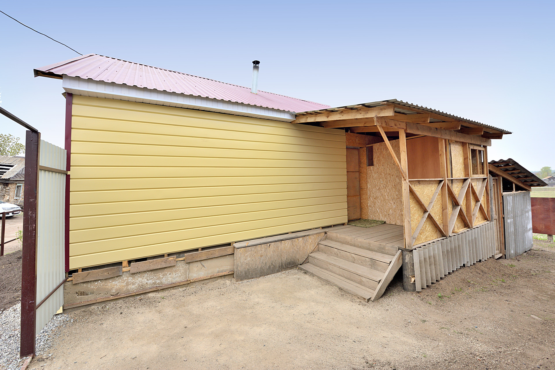 Кровля - новые доски (обрешётка), гидроизоляция, бордовый новый профлист.