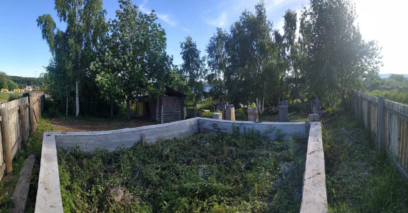 На участке имеется ленточный фундамент под дом 6800 * 9900.