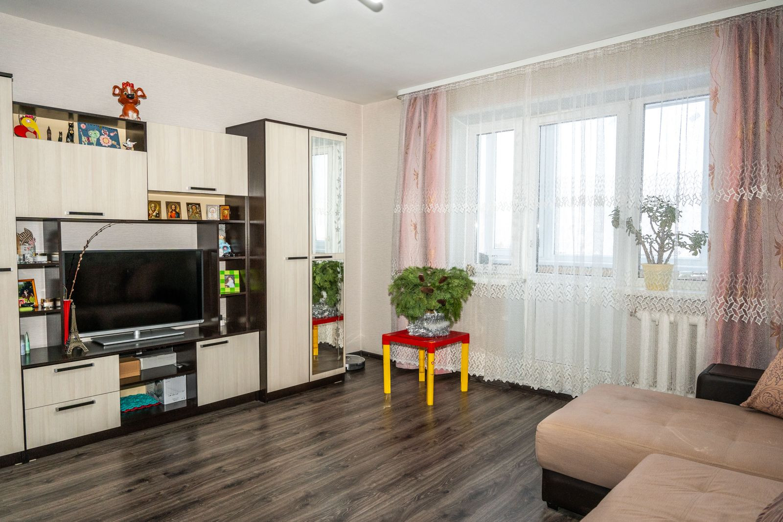 В квартире сделан хороший ремонт, установлены качественные межкомнатные двери, евроокна. Стены и потолки выровнены строительными смесями. В комнатах и на кухне на полу ламинат, в коридоре линолеум. Стены оклеины обоями. Туалет и ванная отделаны кафелем. Балкон застеклен стеклопакетами и обшит вагонкой.