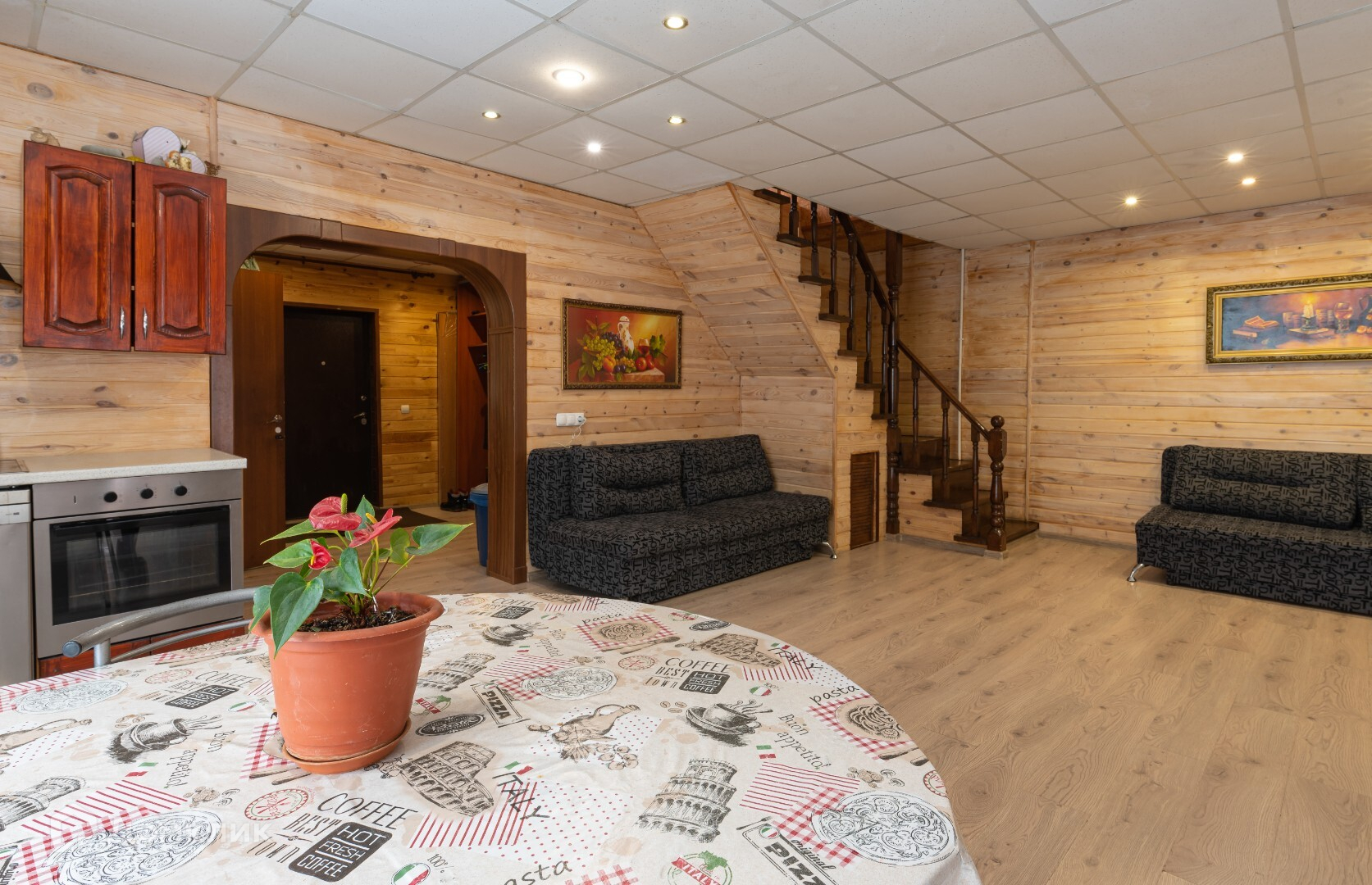 На первом этаже расположена бойлерная - хозблок, санузел, кухня - полностью оборудована. Также столовая-гостиная с панорамными окнами.