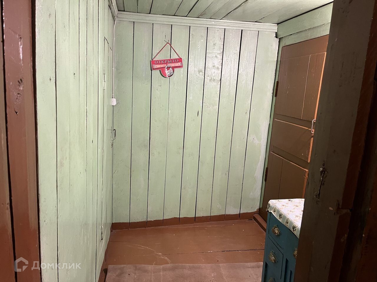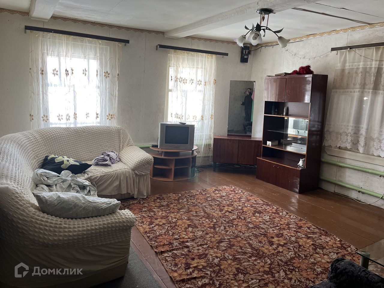 На стенах - обои, потолки покрашены, пол деревянный.