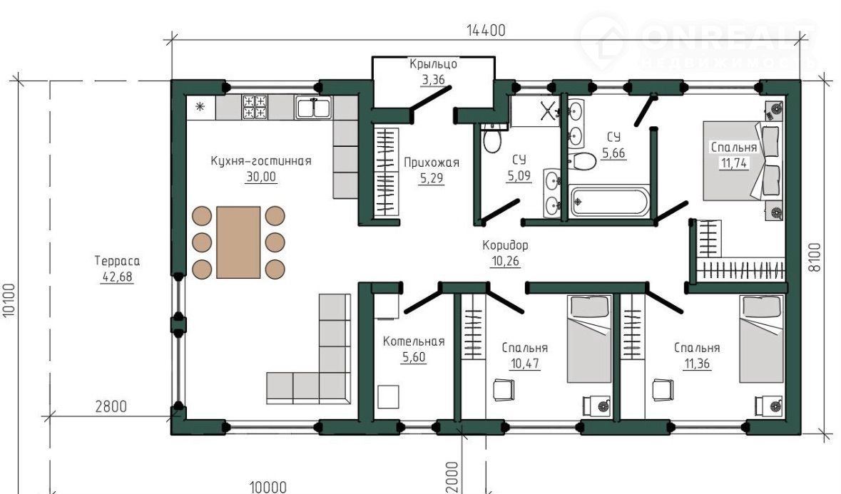 Общая площадь дома — 100 м²