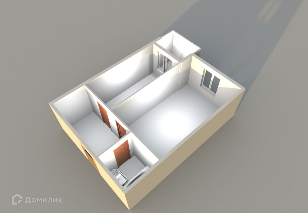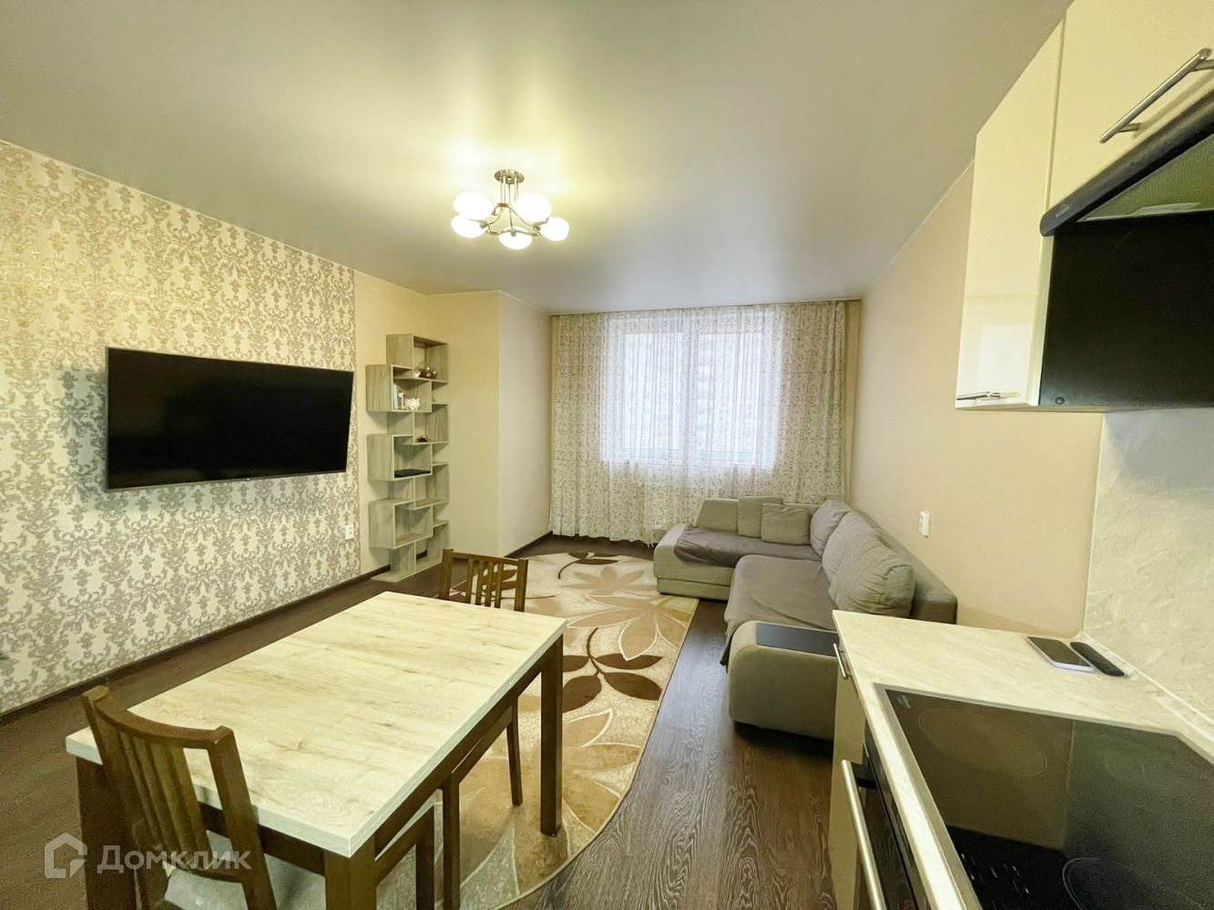 Евро-двухкомнатная квартира с кухней-гостиной 23 м2 и балконом с панорамными окнами.