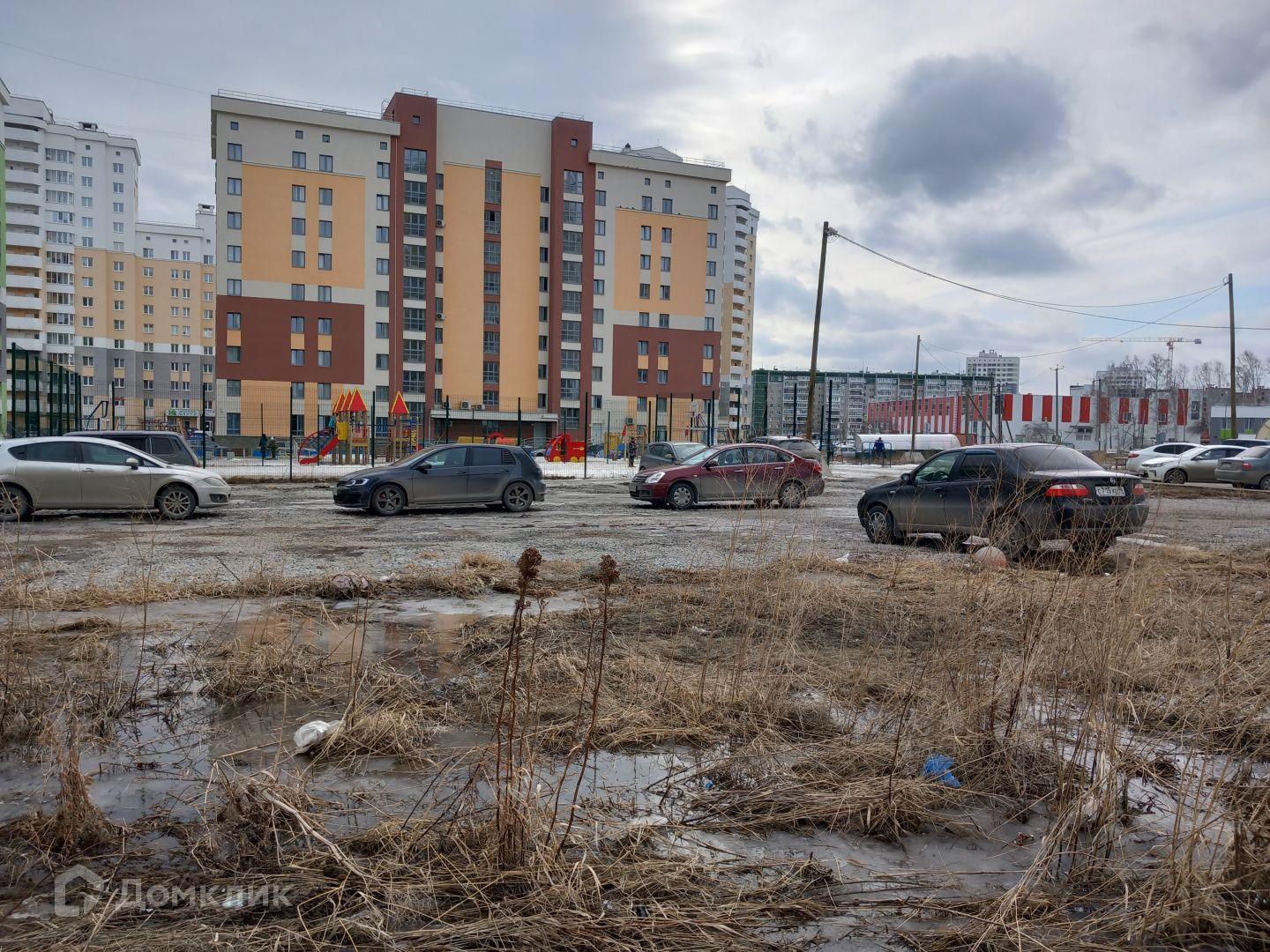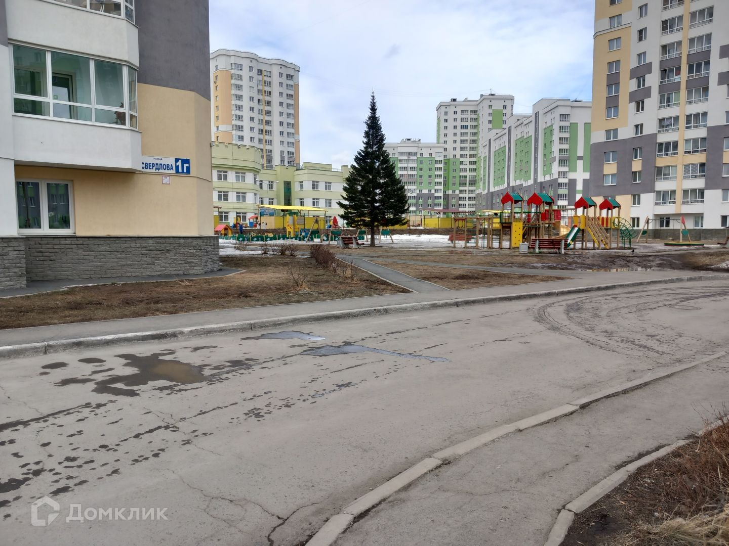 Во дворе современные детские площадки, и детский сад.