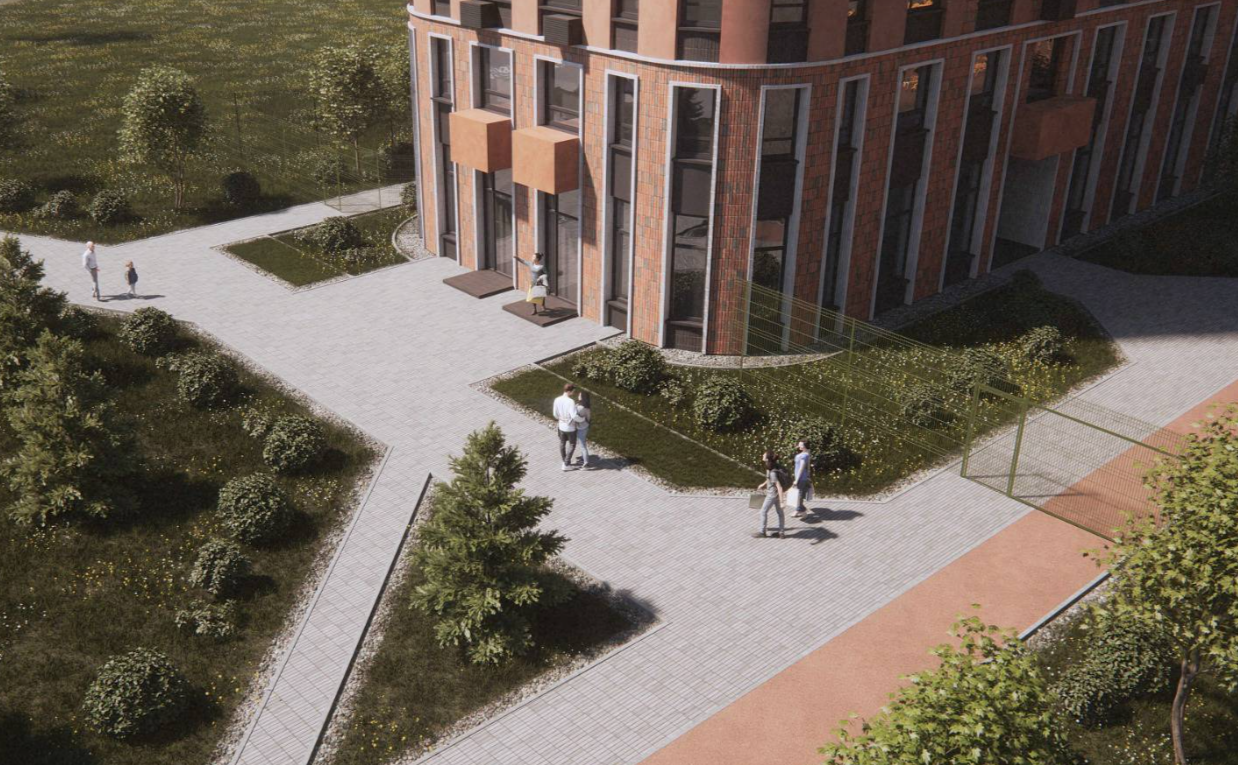 Структура светлых фасадов со стороны двора, ниспадающий к парку каскад, функциональные велопарковки образуют камерные просторные дворовые пространства для прогулок и спортивног отдыха. Удобные парковые скамейки и вписанные в общих ландшафт павильоны и пергол еще больше подчеркивают визуальное единство комплекса.