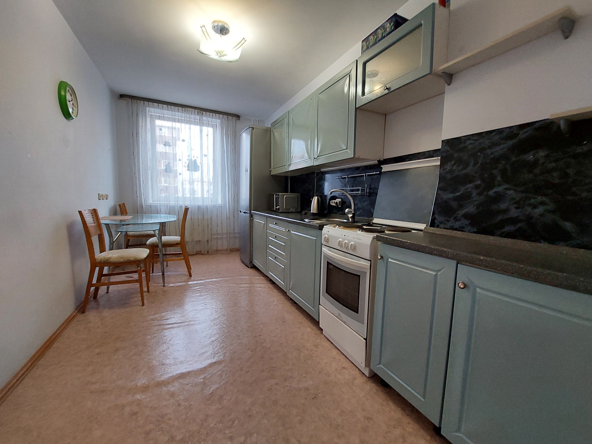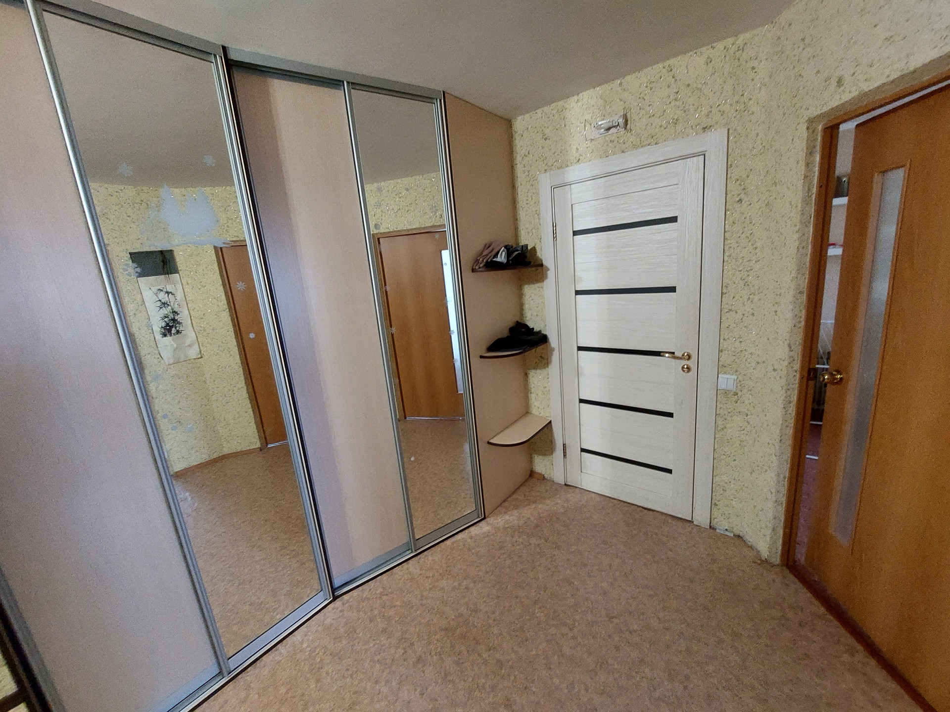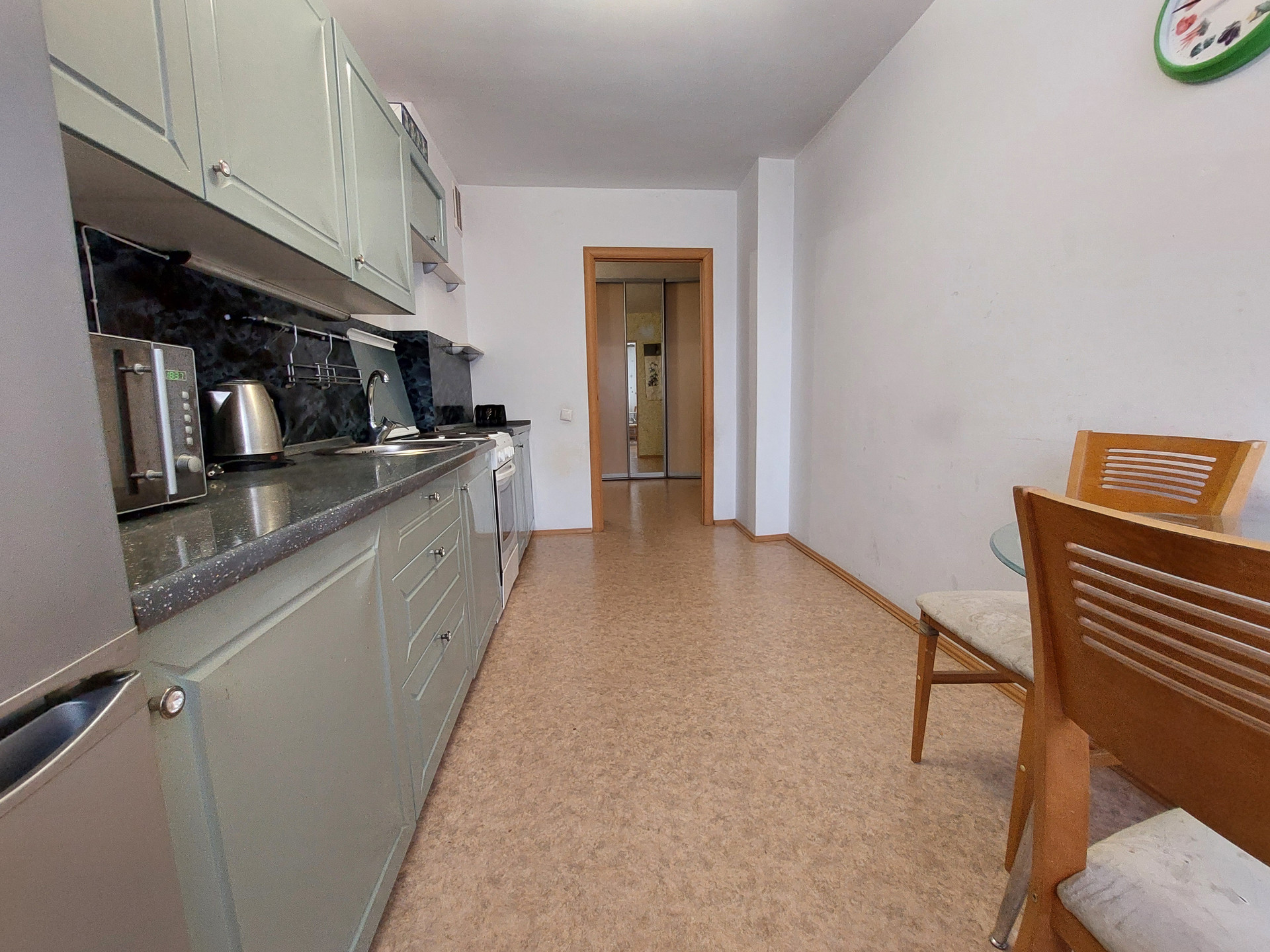 В квартире остается встроенная мебель: кухонный гарнитур, шкаф-купе.