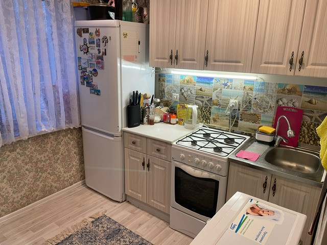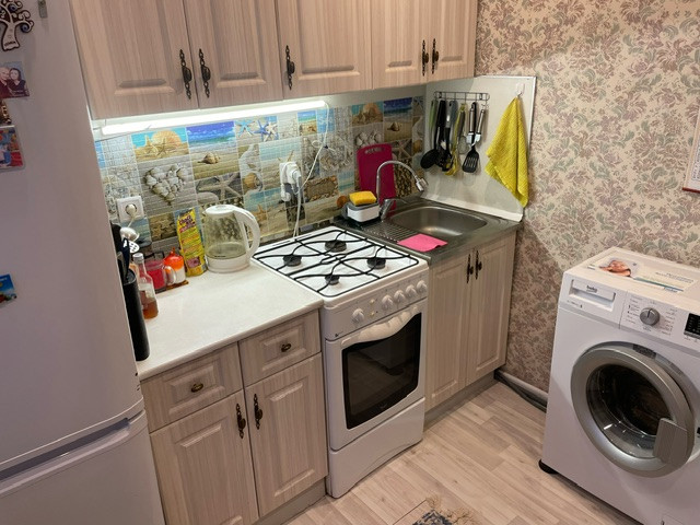 В квартире остается кухонный гарнитур, плита, водонагреватель шкафы и диван.