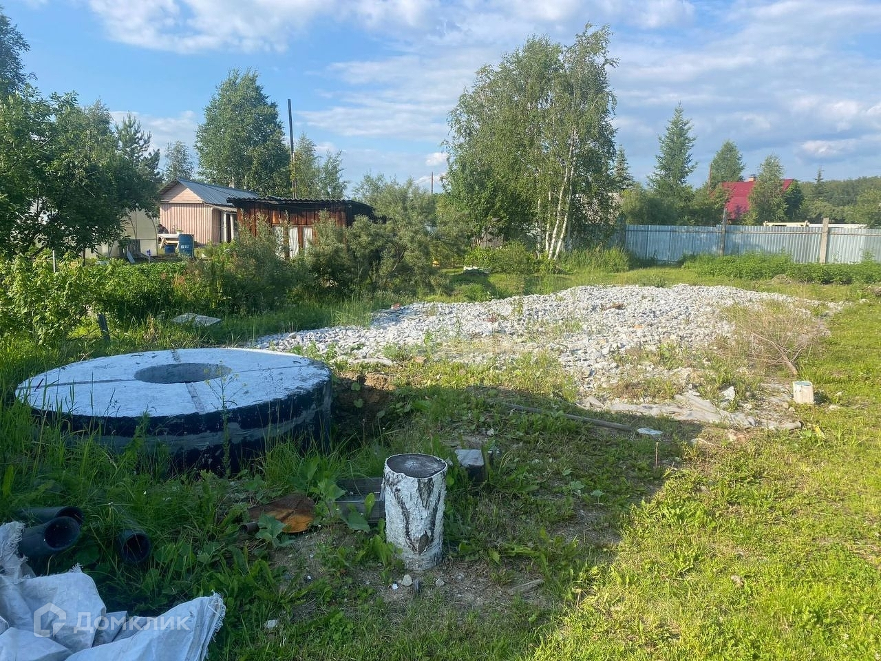 На участке стоит бытовка, теплица, есть выгребная яма.