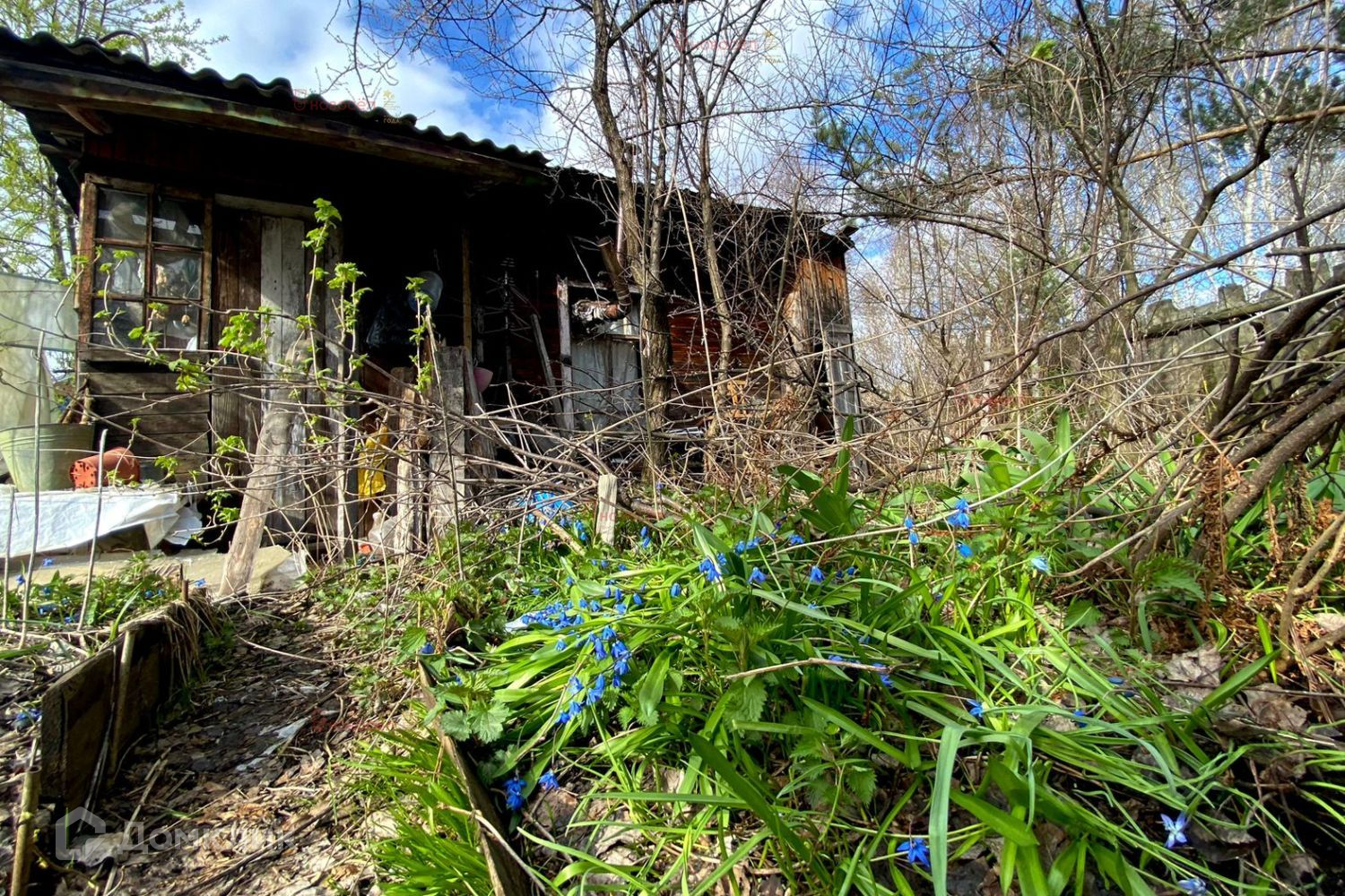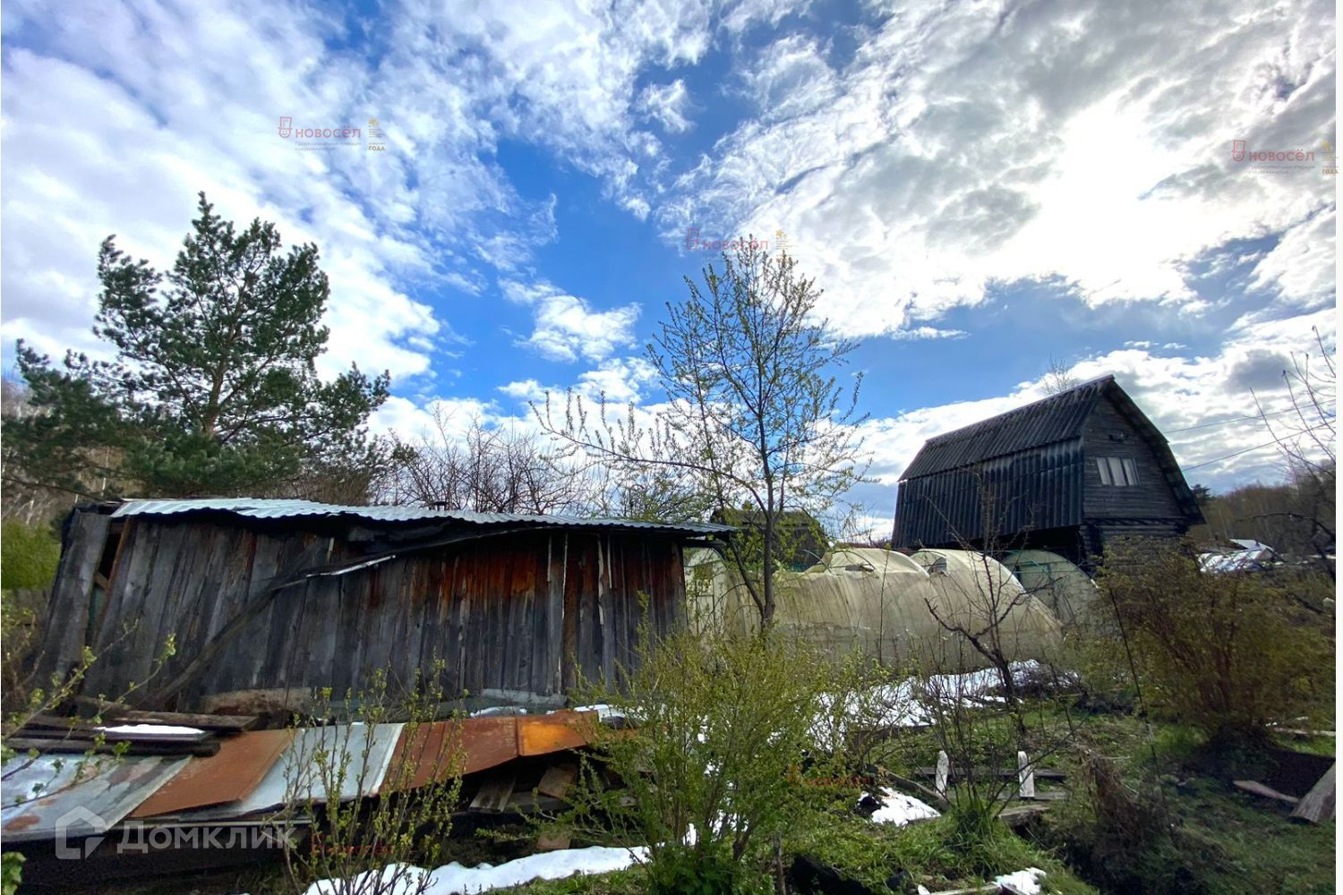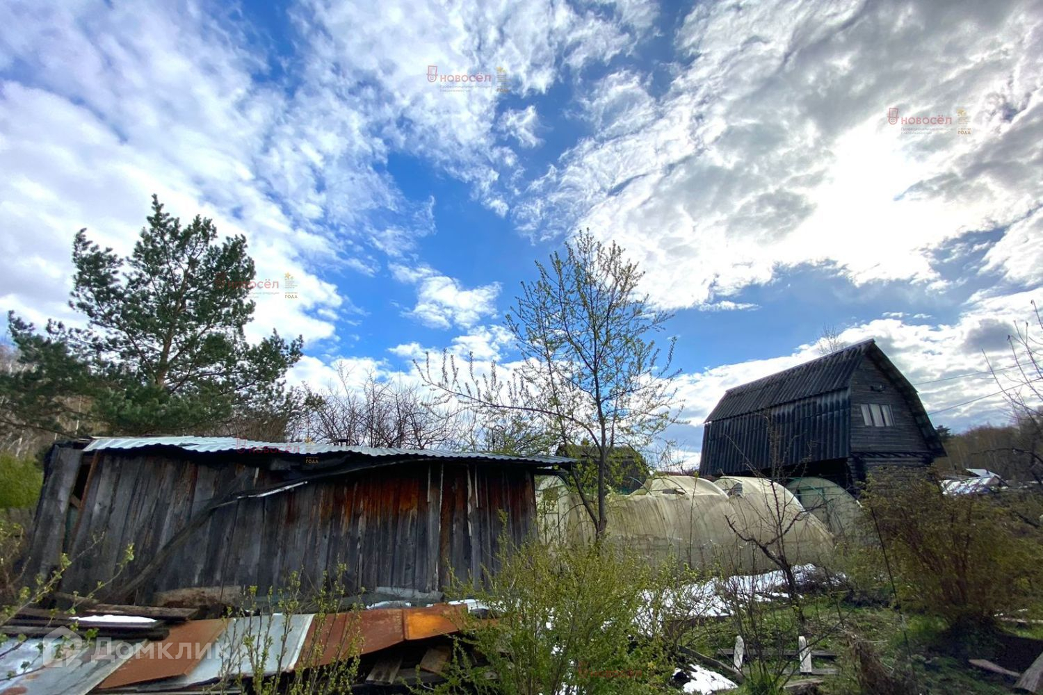 На участке расположены: недостроенный двухэтажный дом с небольшим подвалом,  многолетние наслаждения (яблони, груши, сливы, ягодные кустарники),