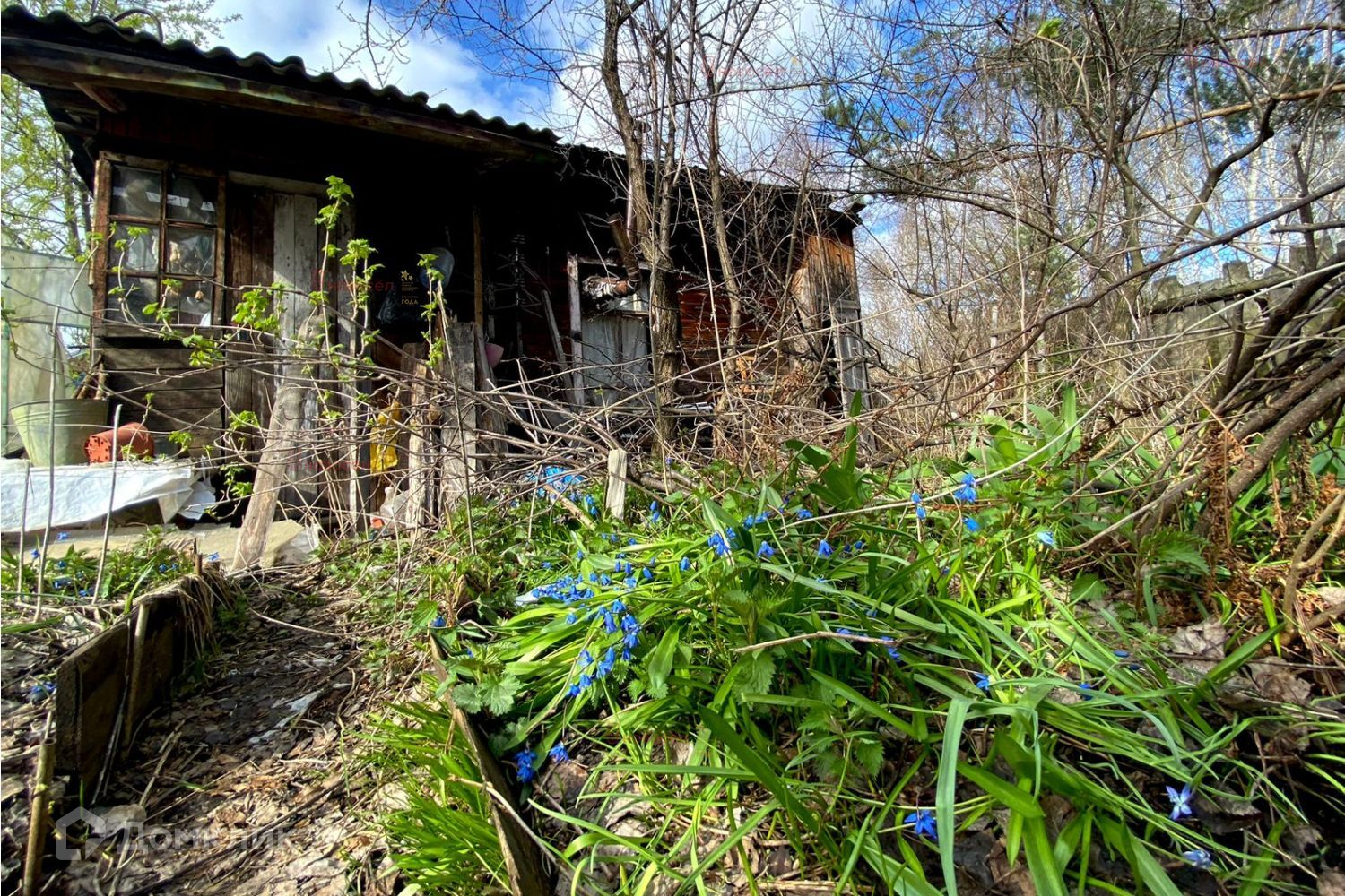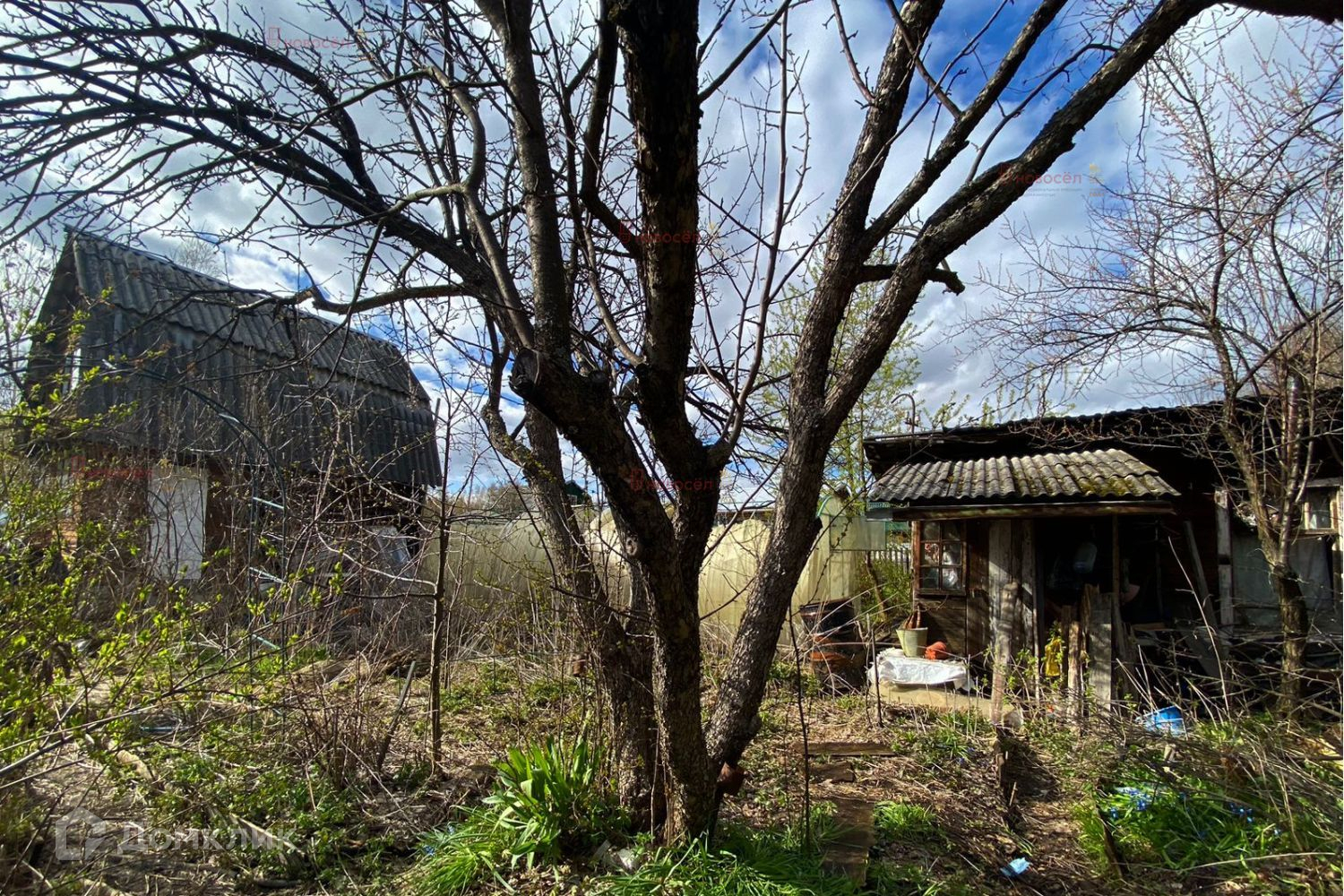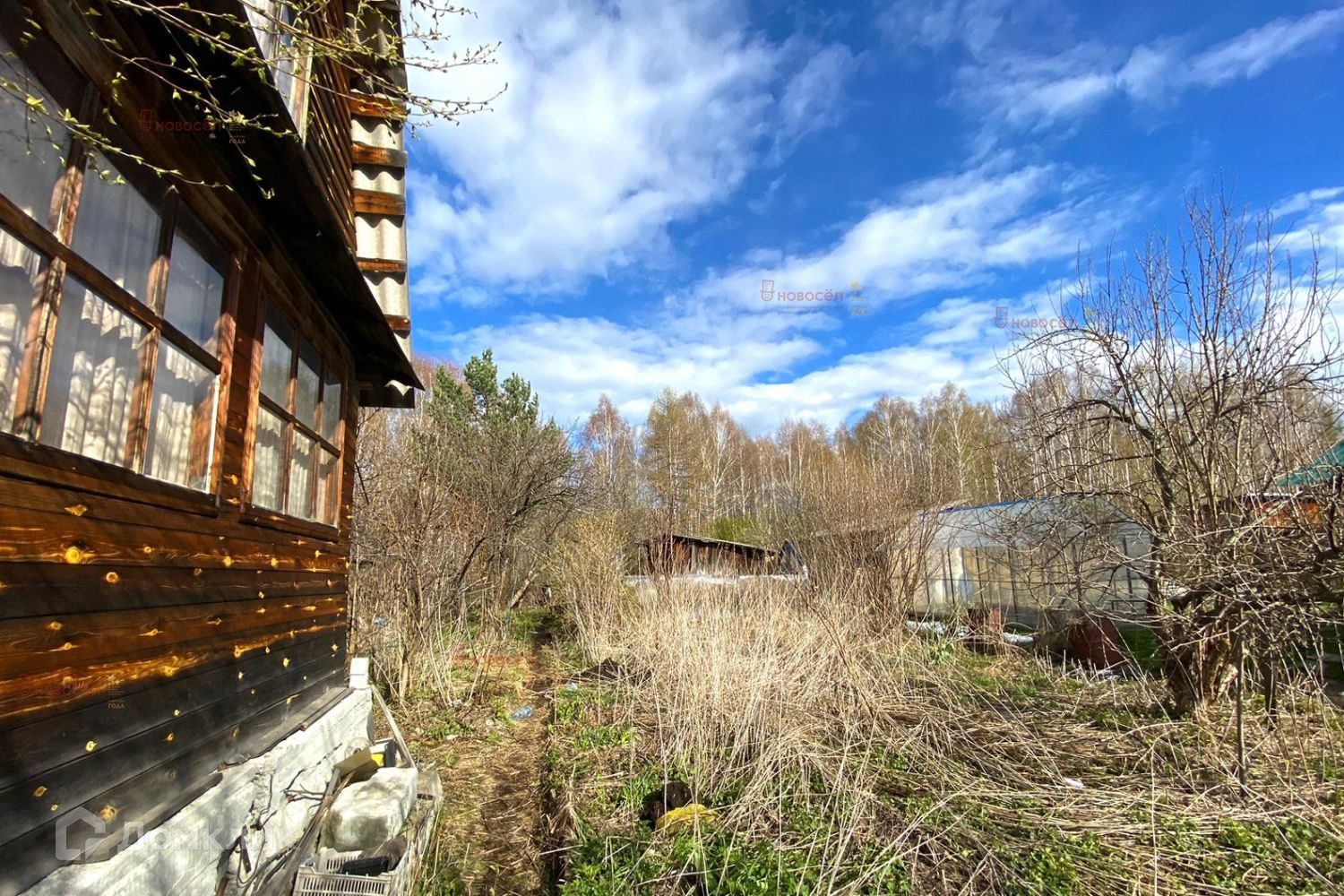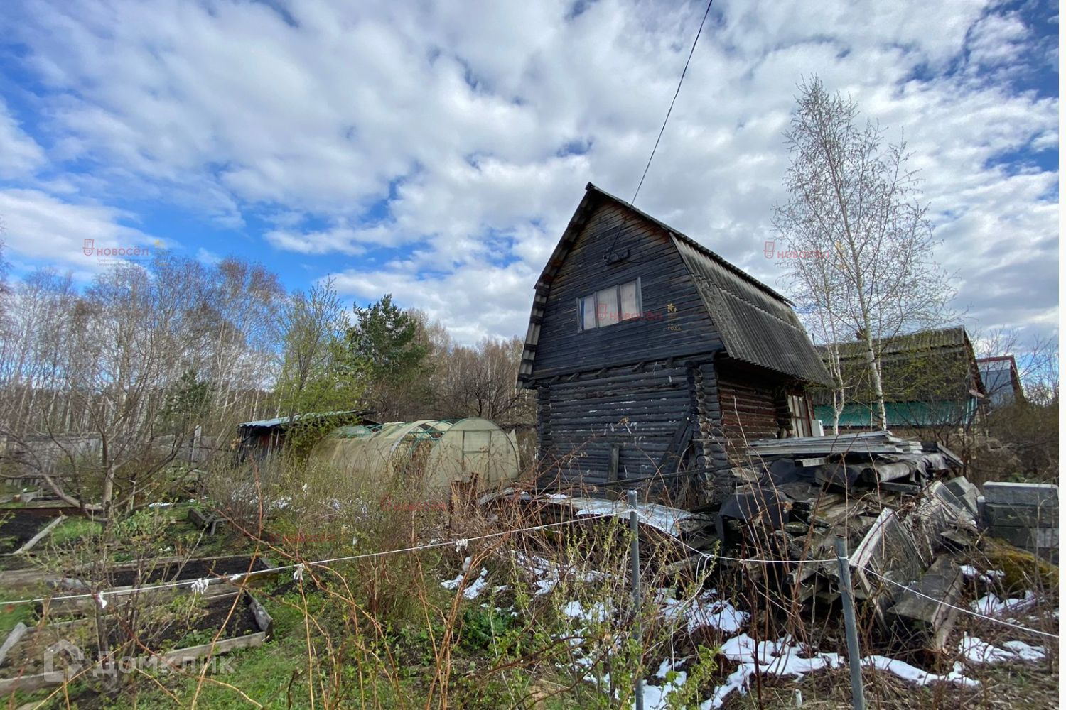 На участке расположены: недостроенный двухэтажный дом с небольшим подвалом,  многолетние наслаждения (яблони, груши, сливы, ягодные кустарники),