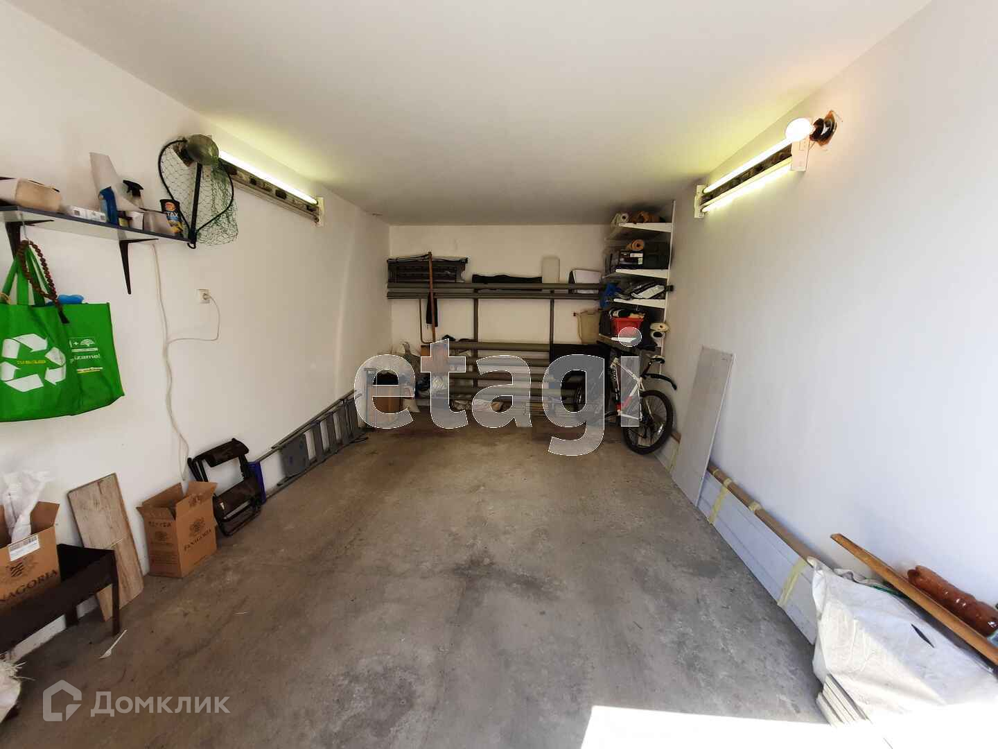 В самом гараже установлены стеллажи, пол и потолок бетонный, ворота железные распашные.