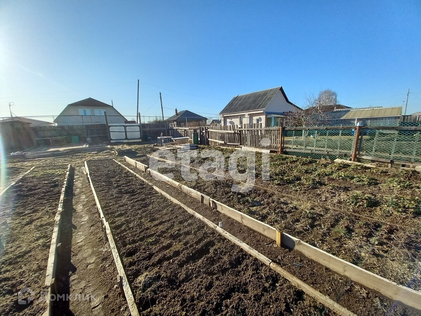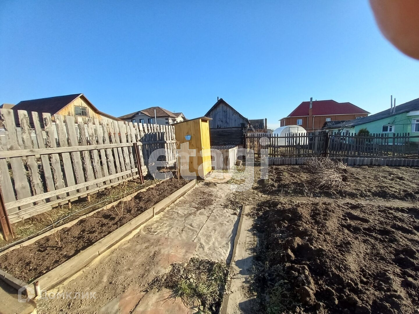 Участок разработан, имеется теплица, грядки огорожены деревом. Также на участке имеются плодоносящие посадки.