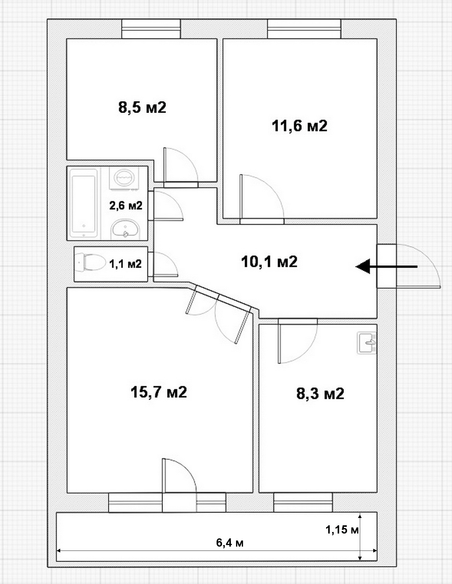 - общая площадь 57,9 м2, высота потолков 2,6 м;