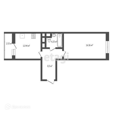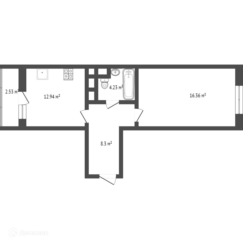 Квартира расположена на 4 этаже. Общая площадь 44.36 кв.м. Холл 8.3 кв.м., кухня-гостиная площадью 12.94 кв.м. с выходом на лоджию площадью 2.53 кв.м., спальня 16.36 кв.м., сан. узел совмещенный 4.23 кв.м.