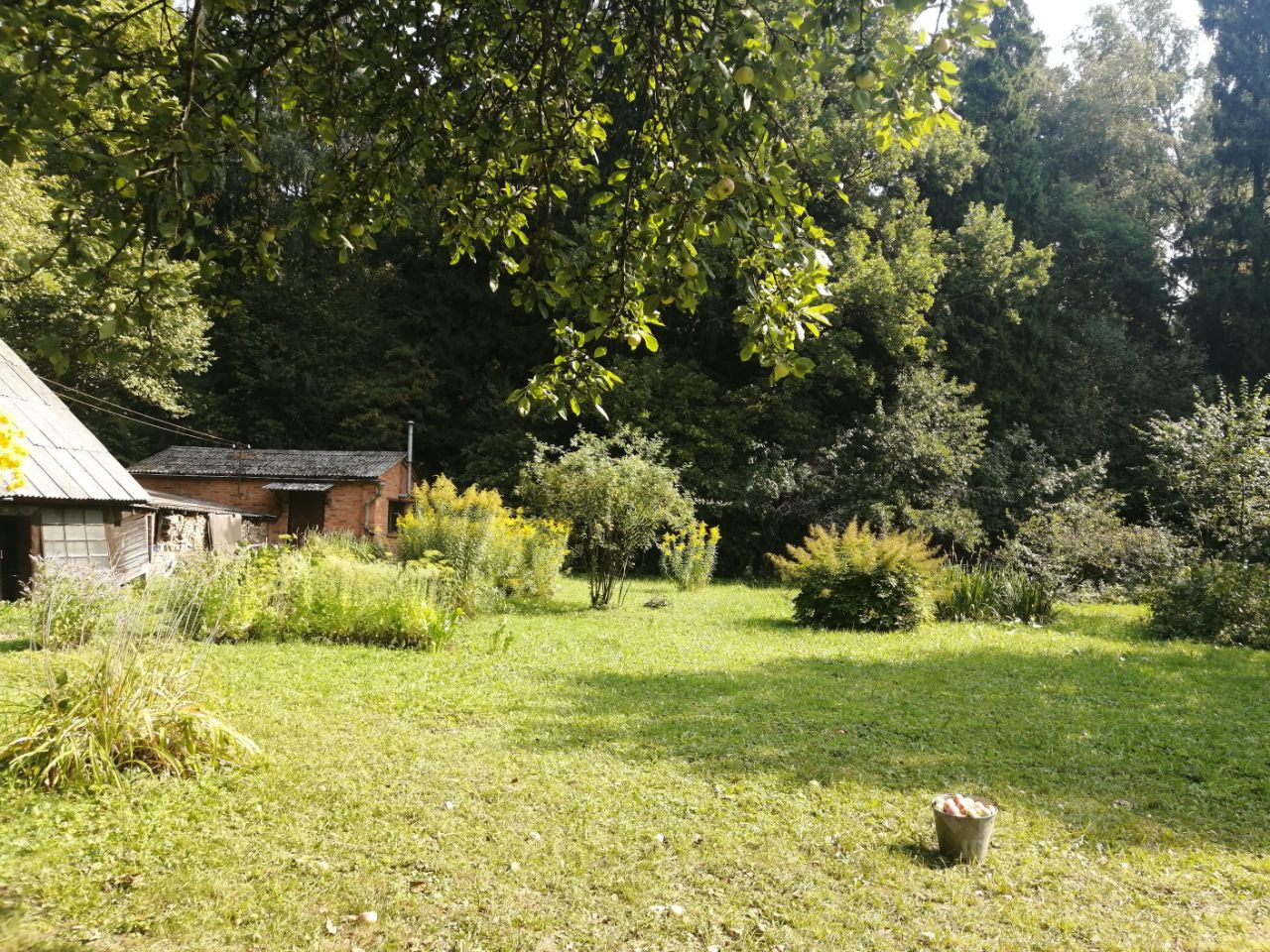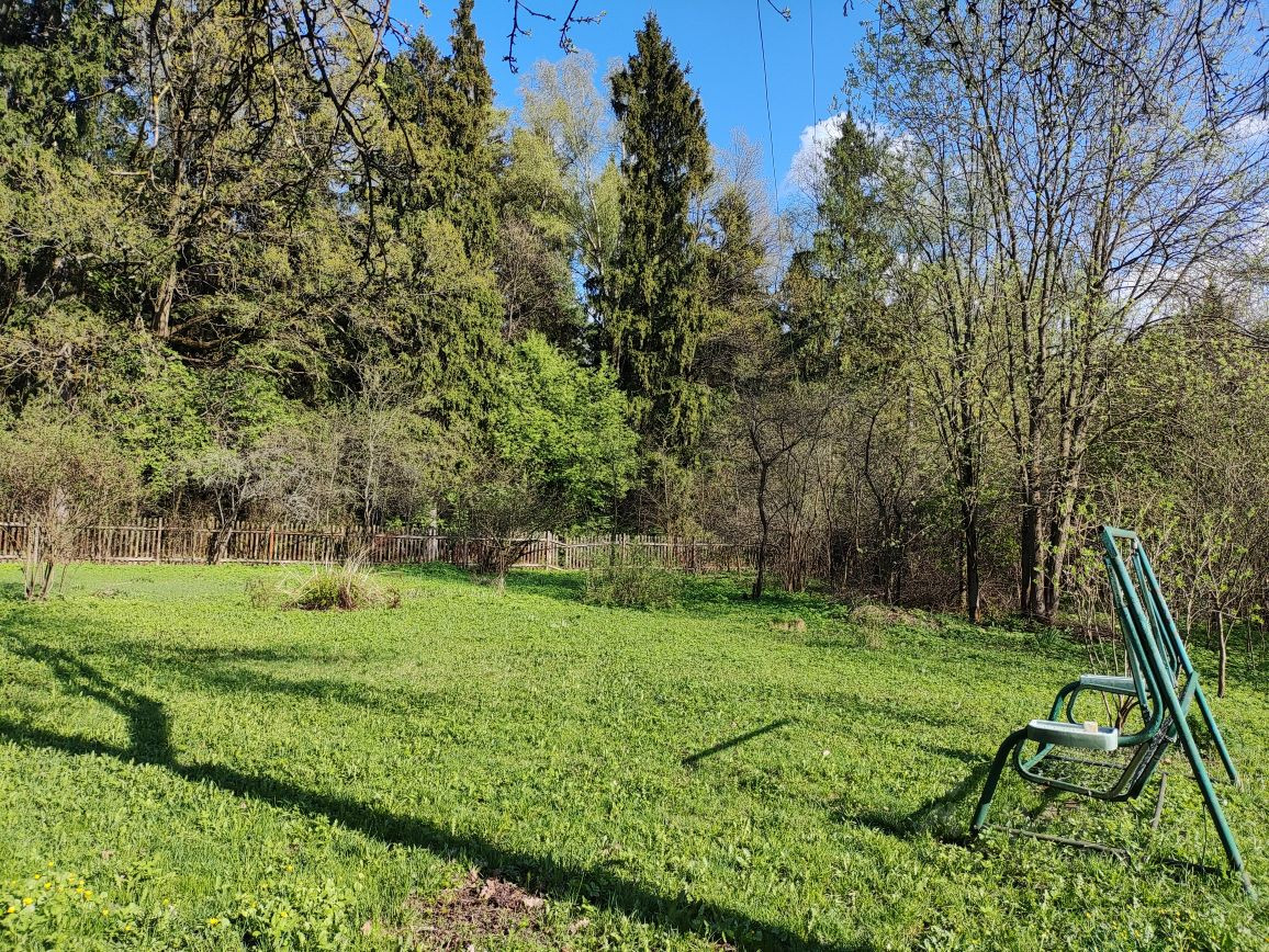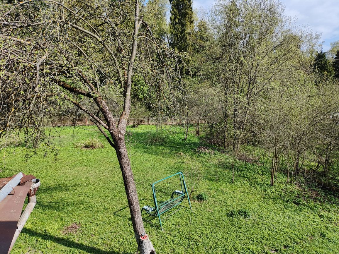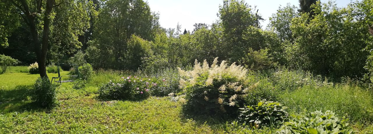 Участок ровный, правильной формы, межевание проведено. Сделаны дорожки, на участке растут плодовые (яблони, сливы, боярышник) и декоративные растения (люпины, тюльпаны), хороший газон.