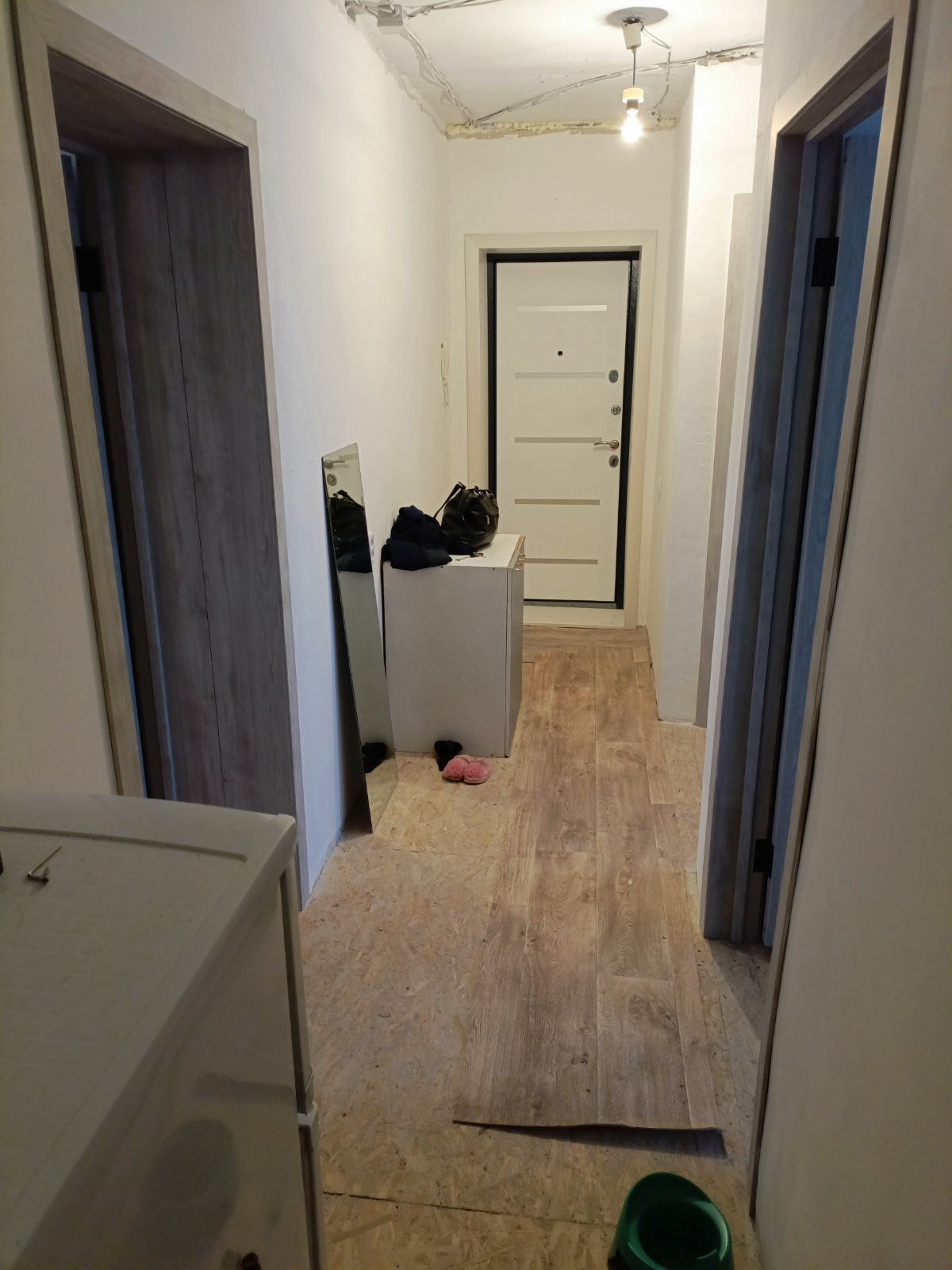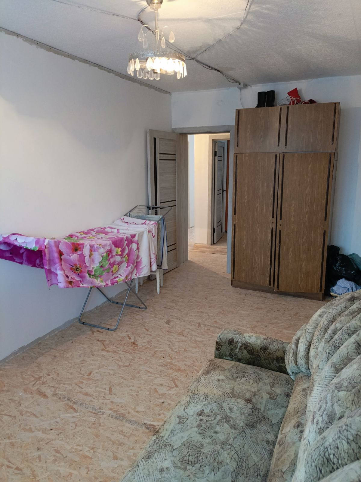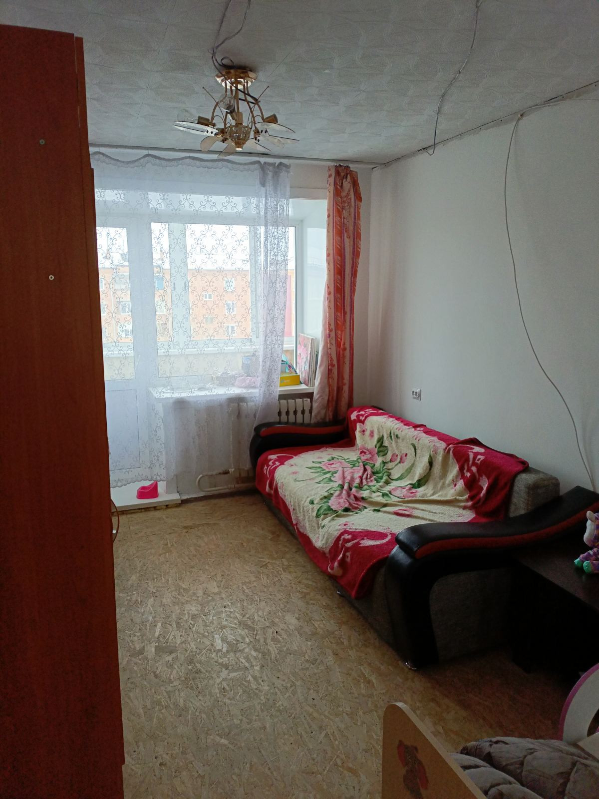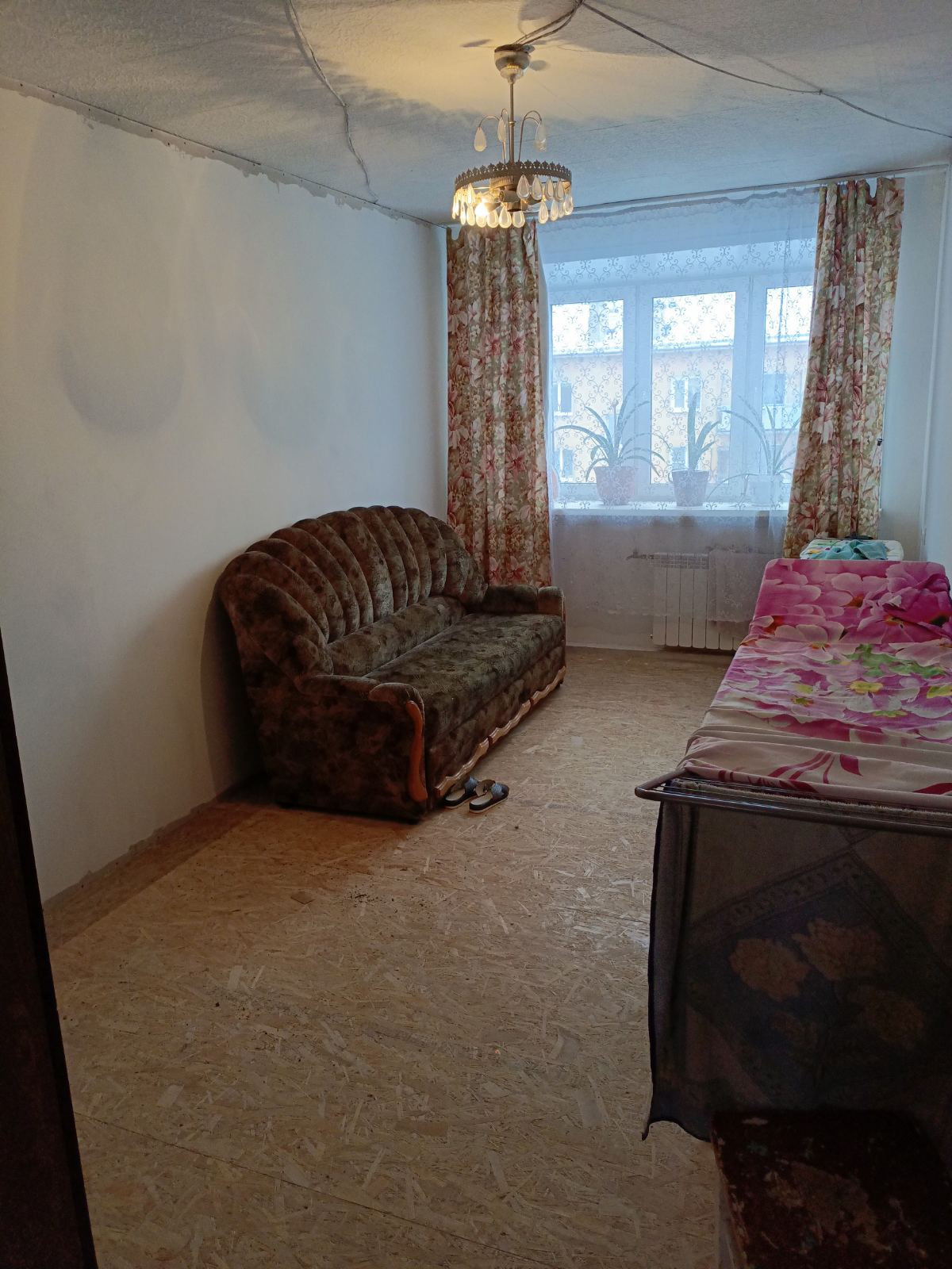 В квартире выравнены стыны (обои не поклеены), пол перестелен ОСБ, окна пластиковые, балкон отделка пластиком AL-раздвижка, сантехника и батареи заменены.