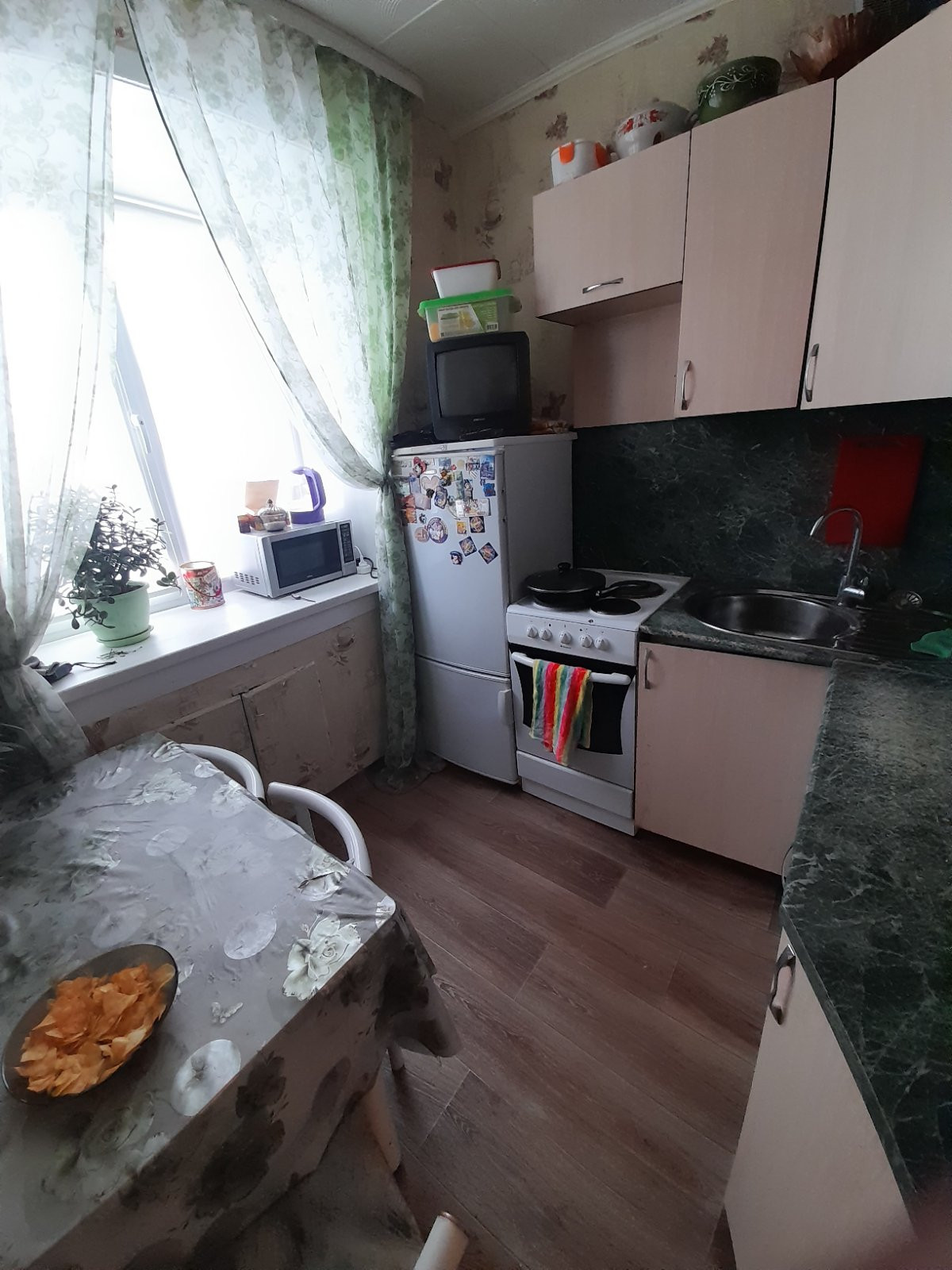 Квартира очень теплая, окна ПВХ, пол частично линолеум. При продаже остается кухня.
