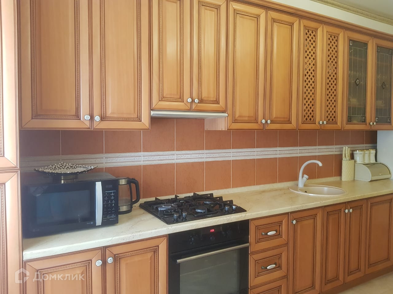 Кухонный гарнитур изготовлен из натурального дерева ясень.