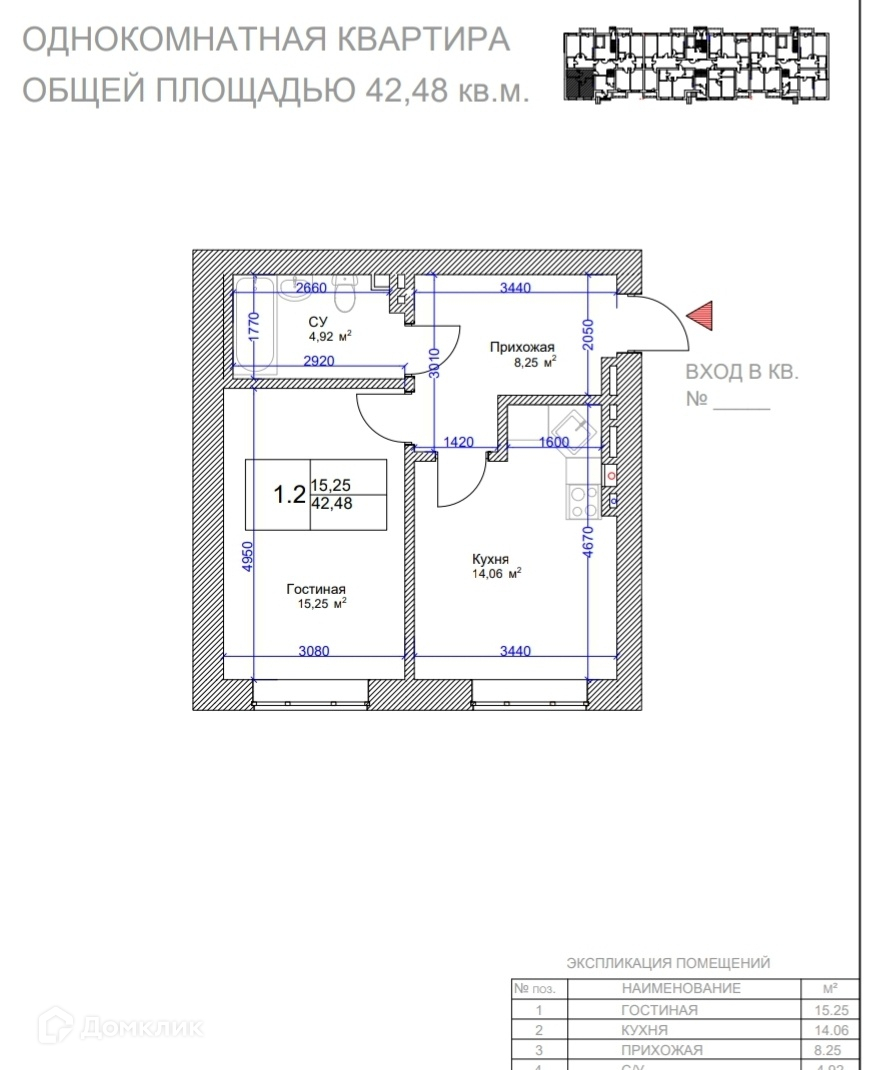 Общая площадь 42.5 м2