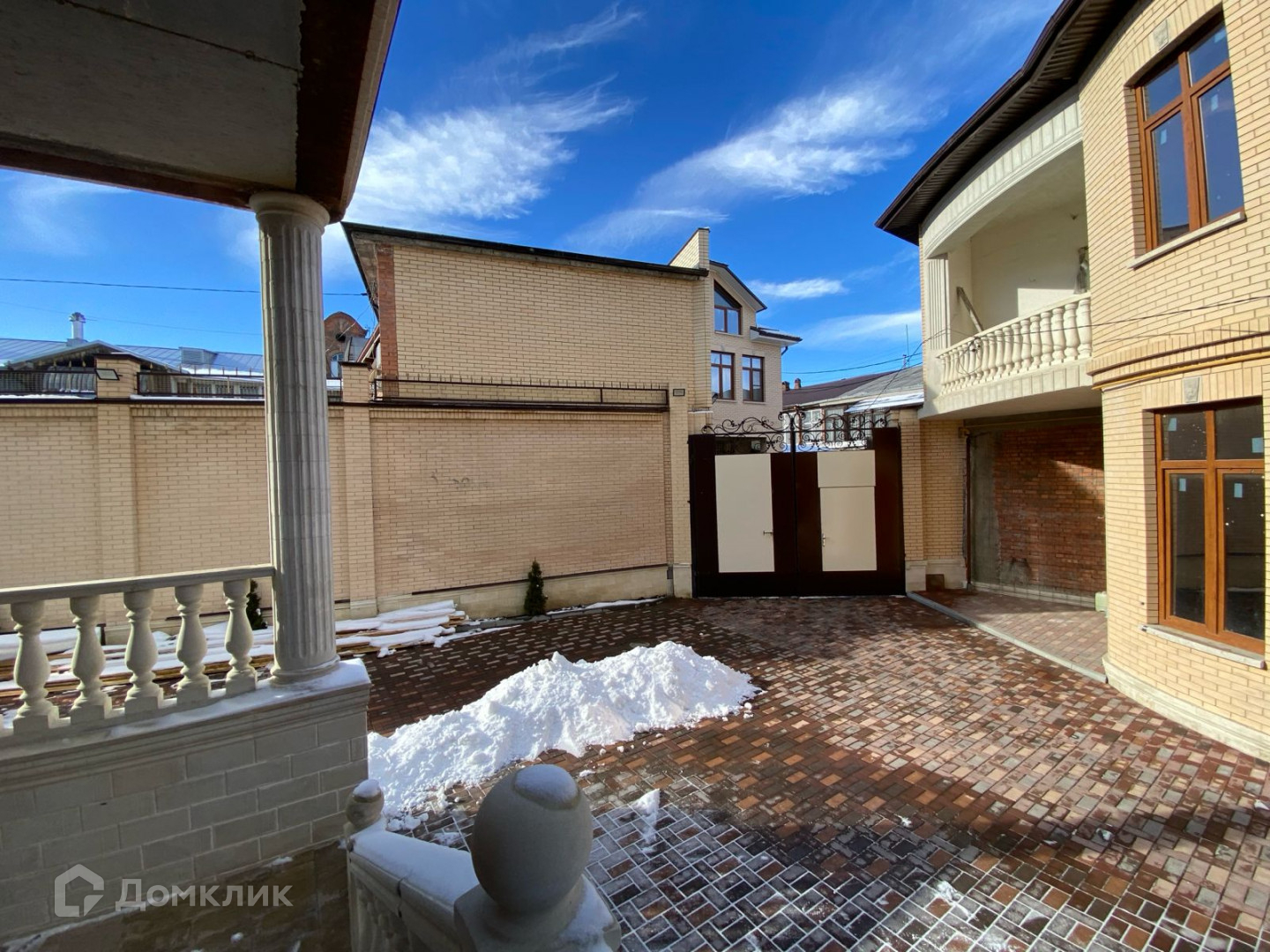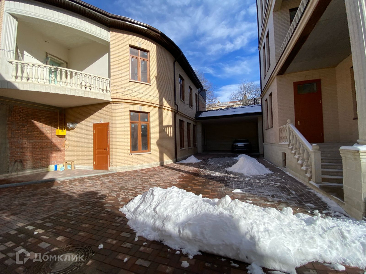 - Уютный внутренний двор дома, выложенный брусчаткой, с зелеными насаждениями;