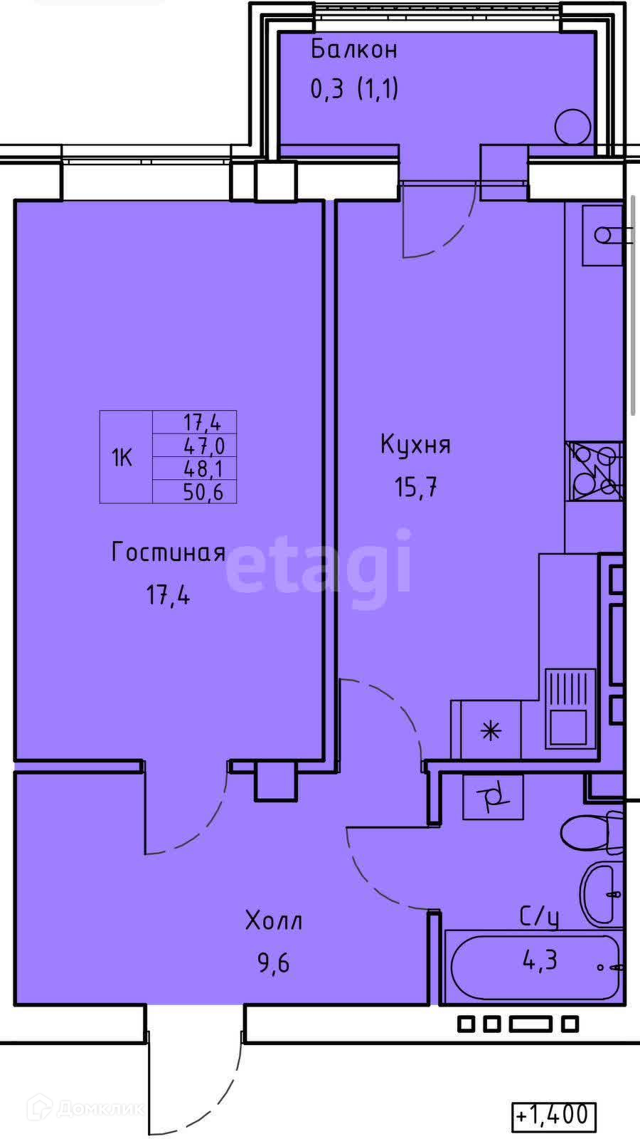 Балкон, лоджия 1 балкон