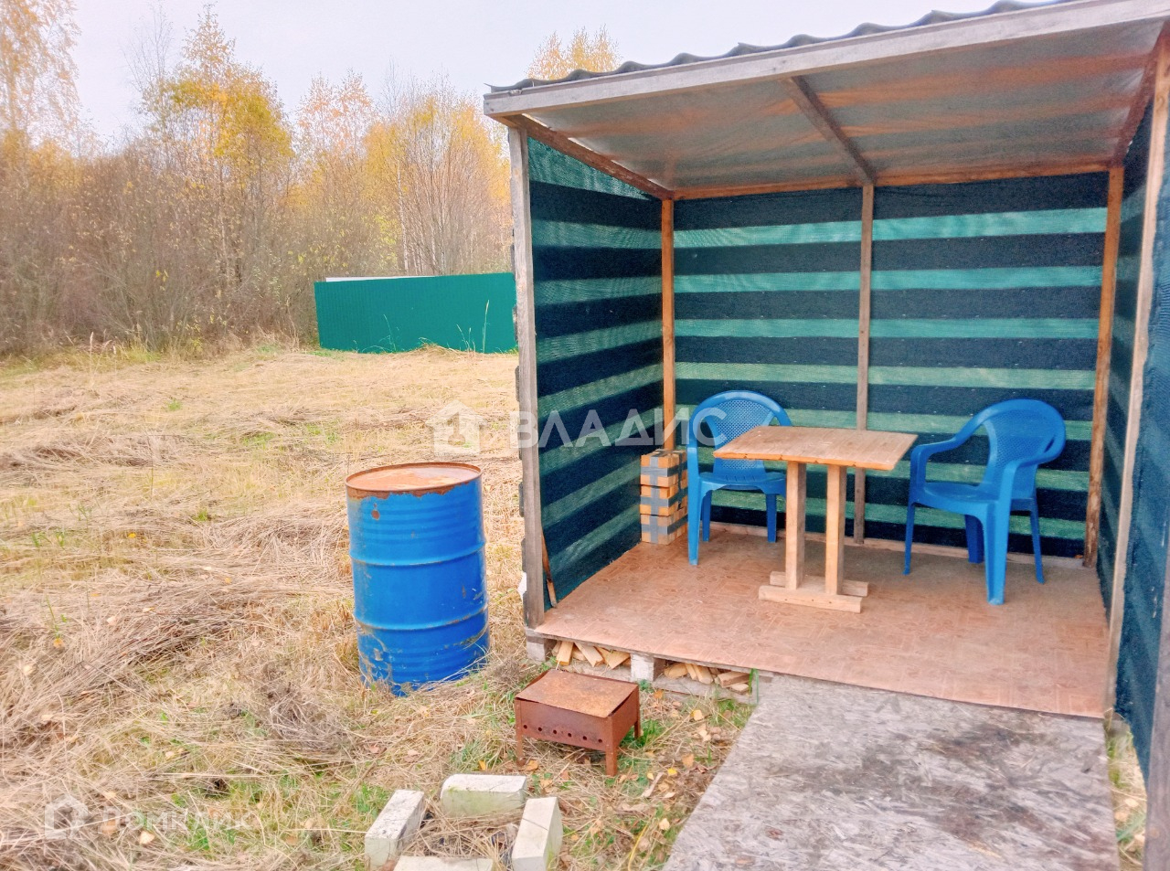 Участок 10,9 соток, ширина 24 м. Ровный, без деревьев и кустов. На территории есть  небольшая беседка для отдыха. Позади участка лес.
