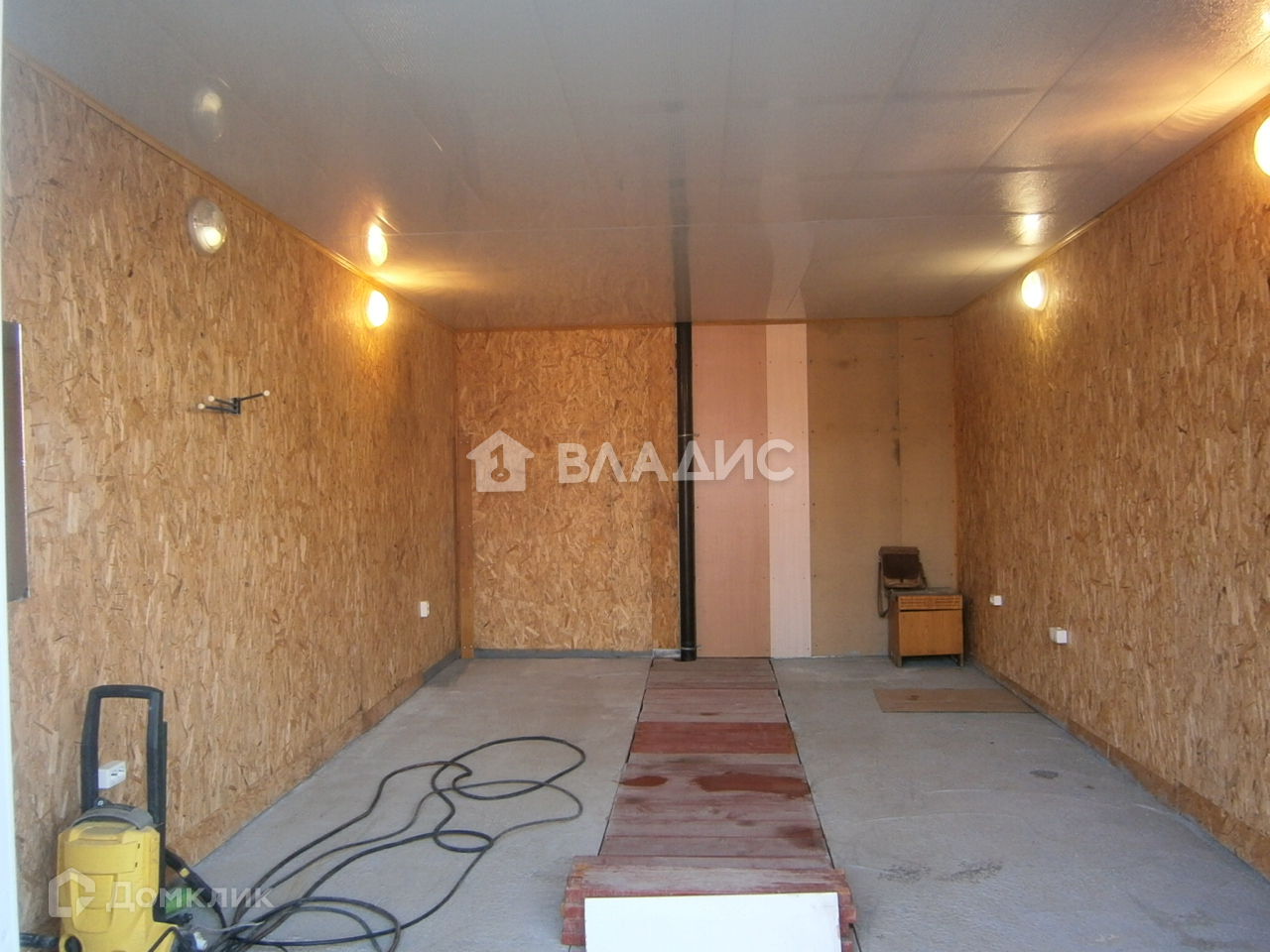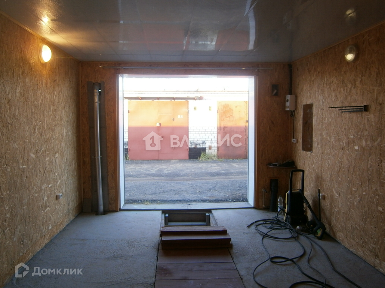 Гараж полностью отделан ОСБ плитой стены и потолок панелями. Все видно на фото.