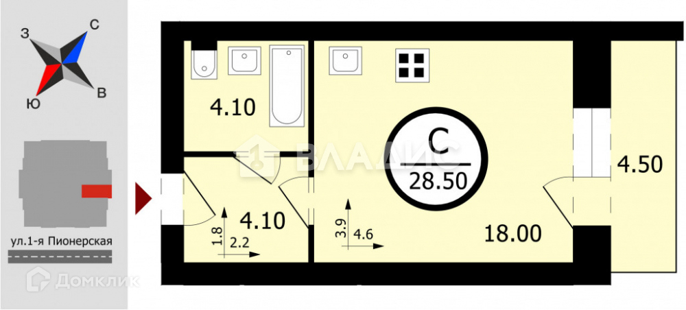 Общая площадь 28.5 м2