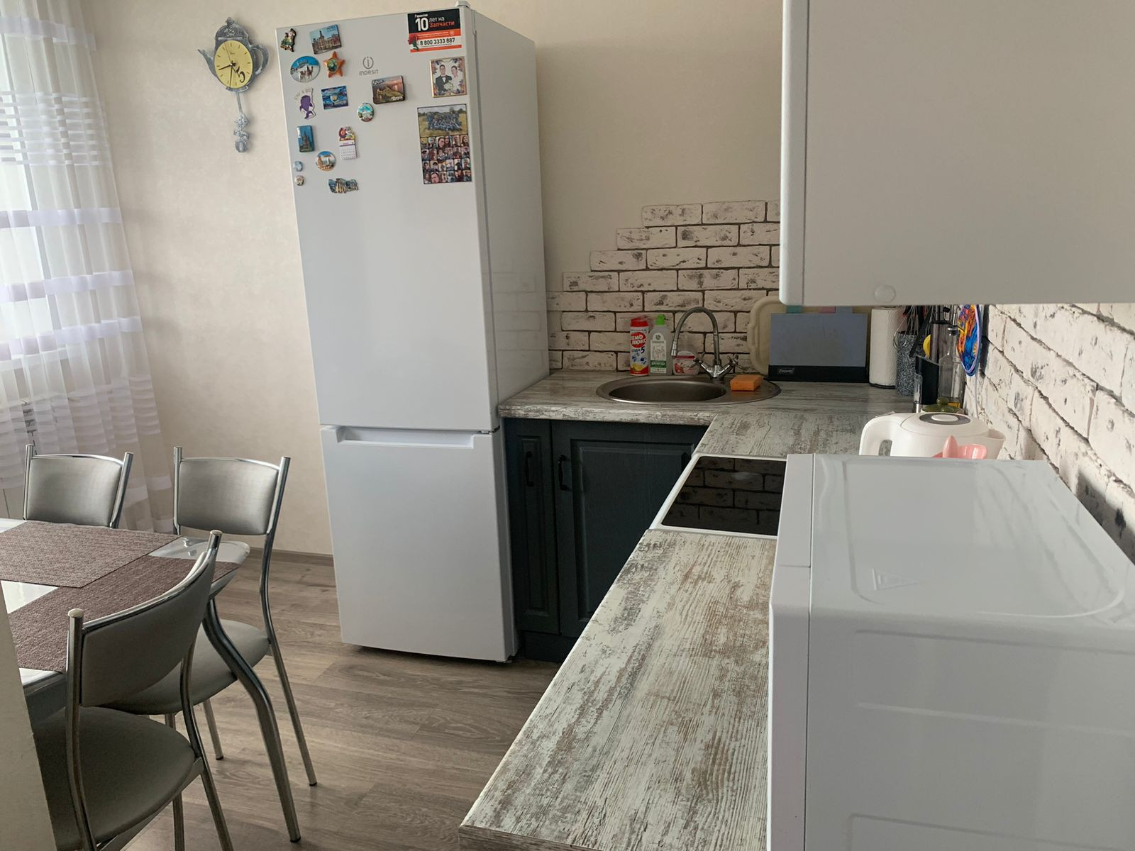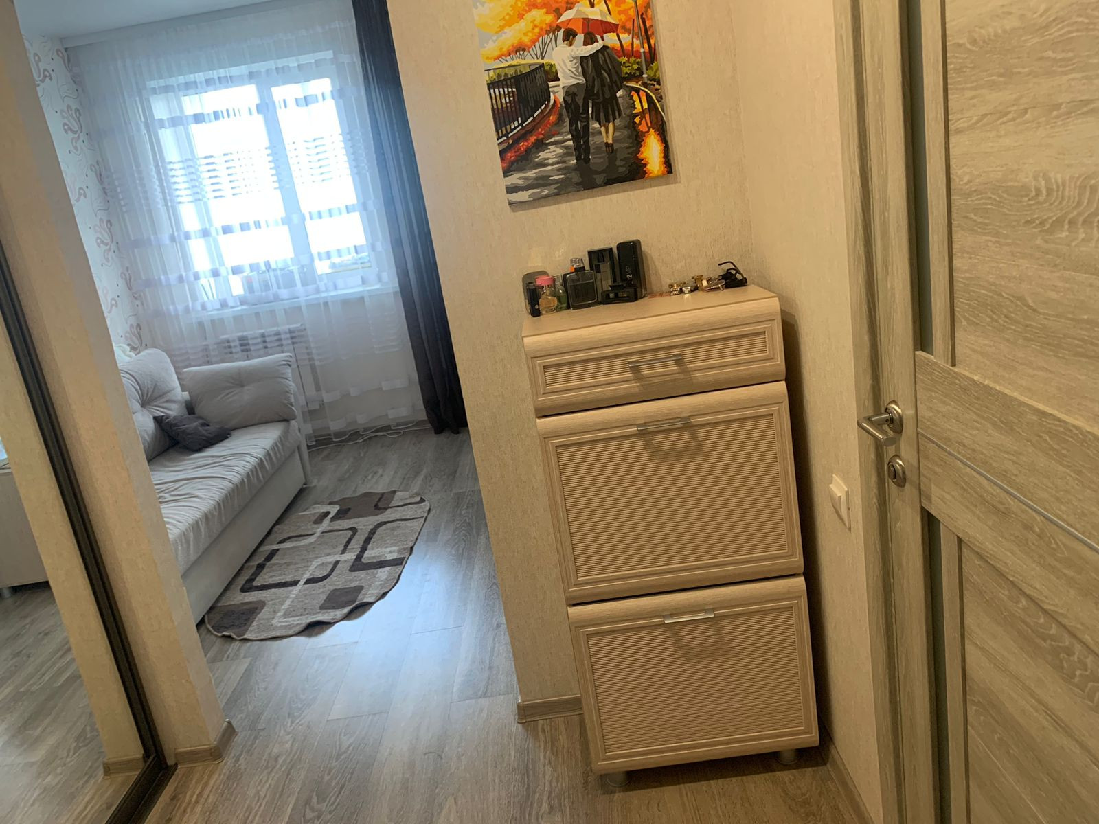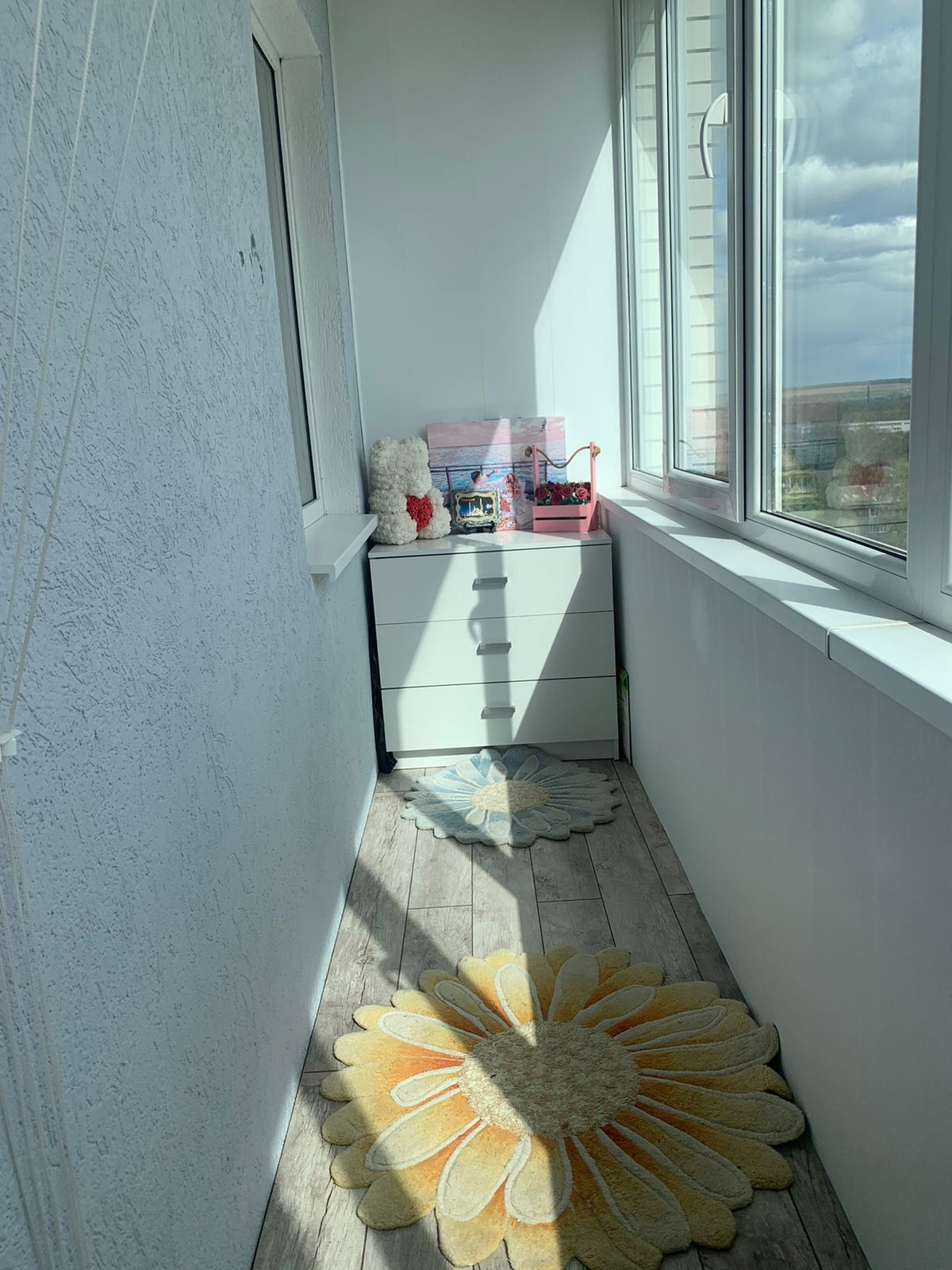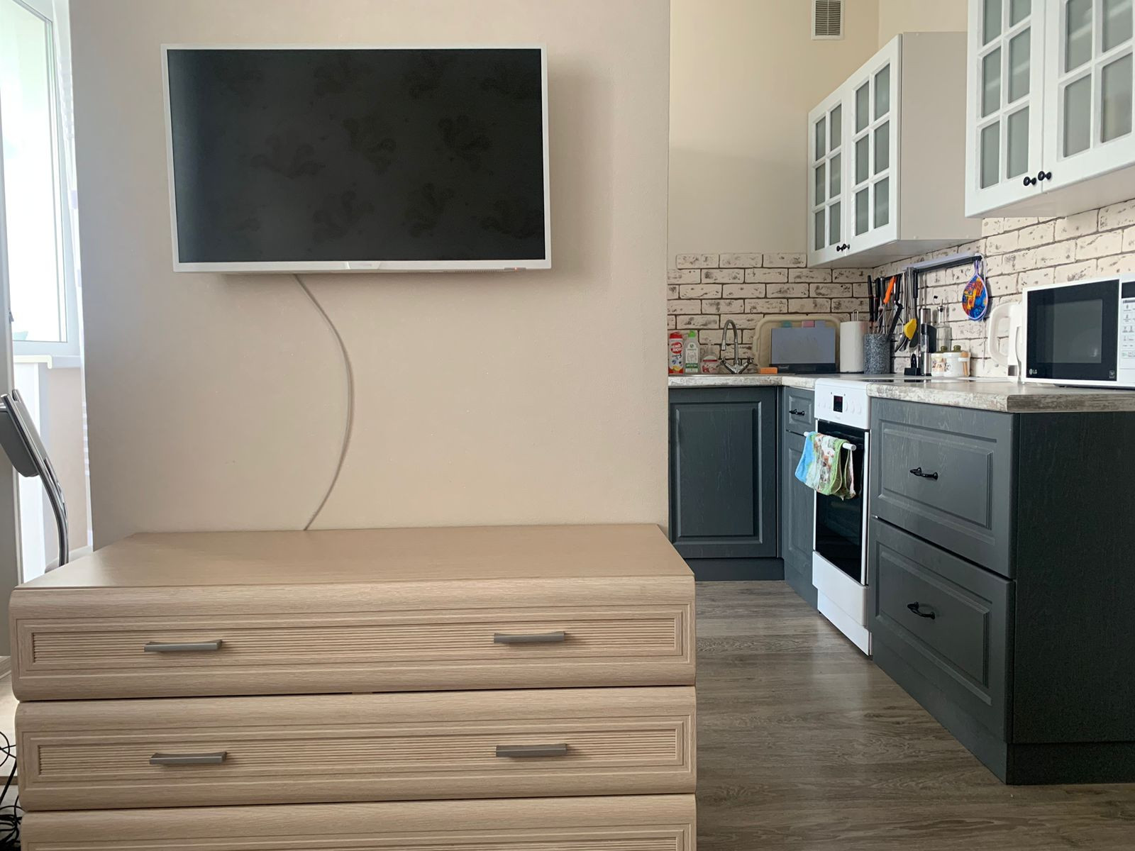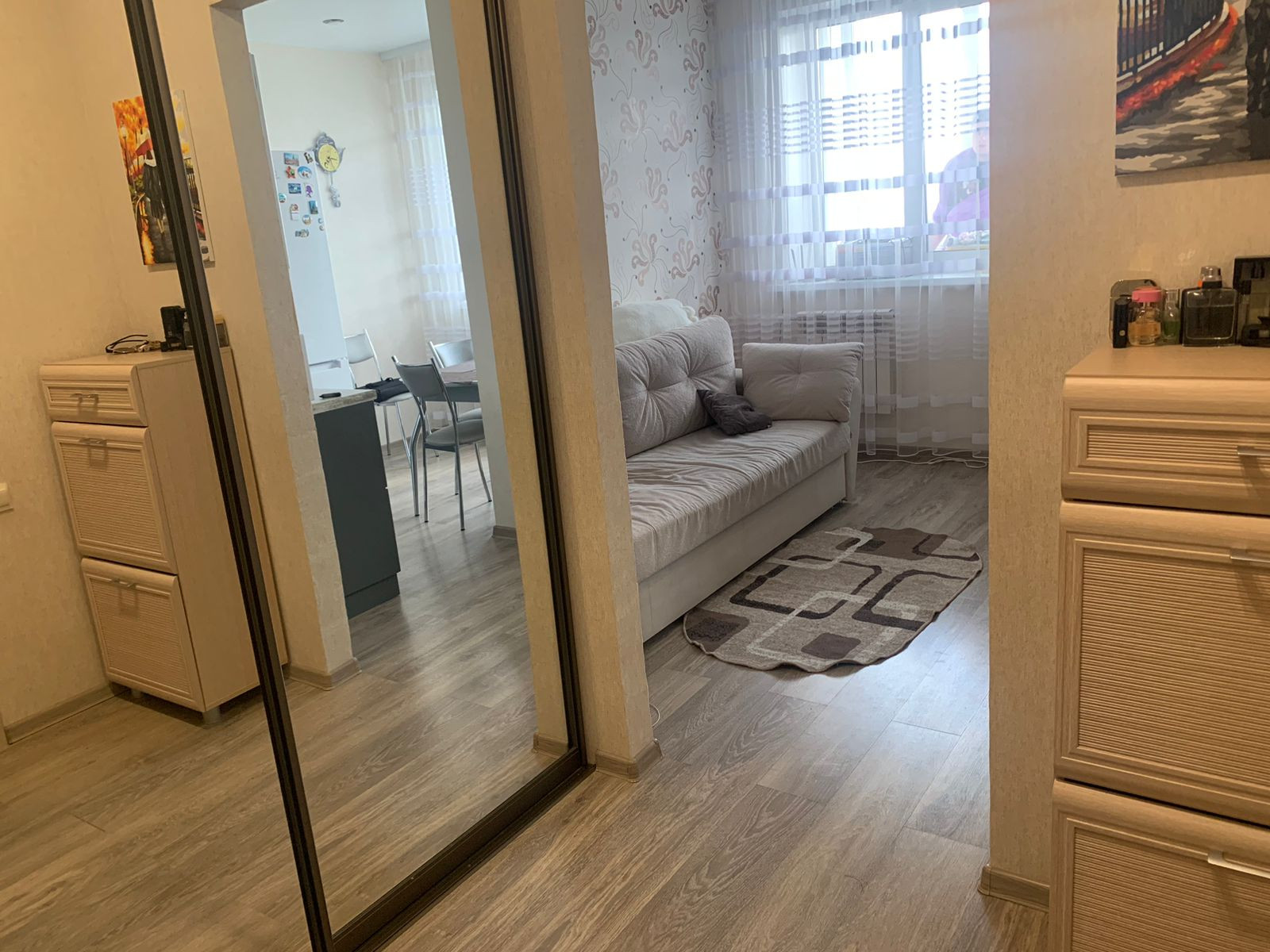 В квартире сделан современный ремонт из качественных материалов. Потолки натяжные, окна ПВХ. На полу ламинат во всей квартире и на балконе, в сан.узле плитка. Балкон утепленный по всей площади, зимой температура +13-15с.  Сан.узел совмещённый, отделанный кафелем, на полу слелан анти пролив и шумоизоляция труб.  Весь ремонт производился для себя с большой любовью и старанием. В квартире лоджия с выходом из кухни.  В квартире есть очень удобная гардеробная. Остается кухонный гарнитур и гардеробная. В квартиру подведено кабельное теоевиление и интернет.