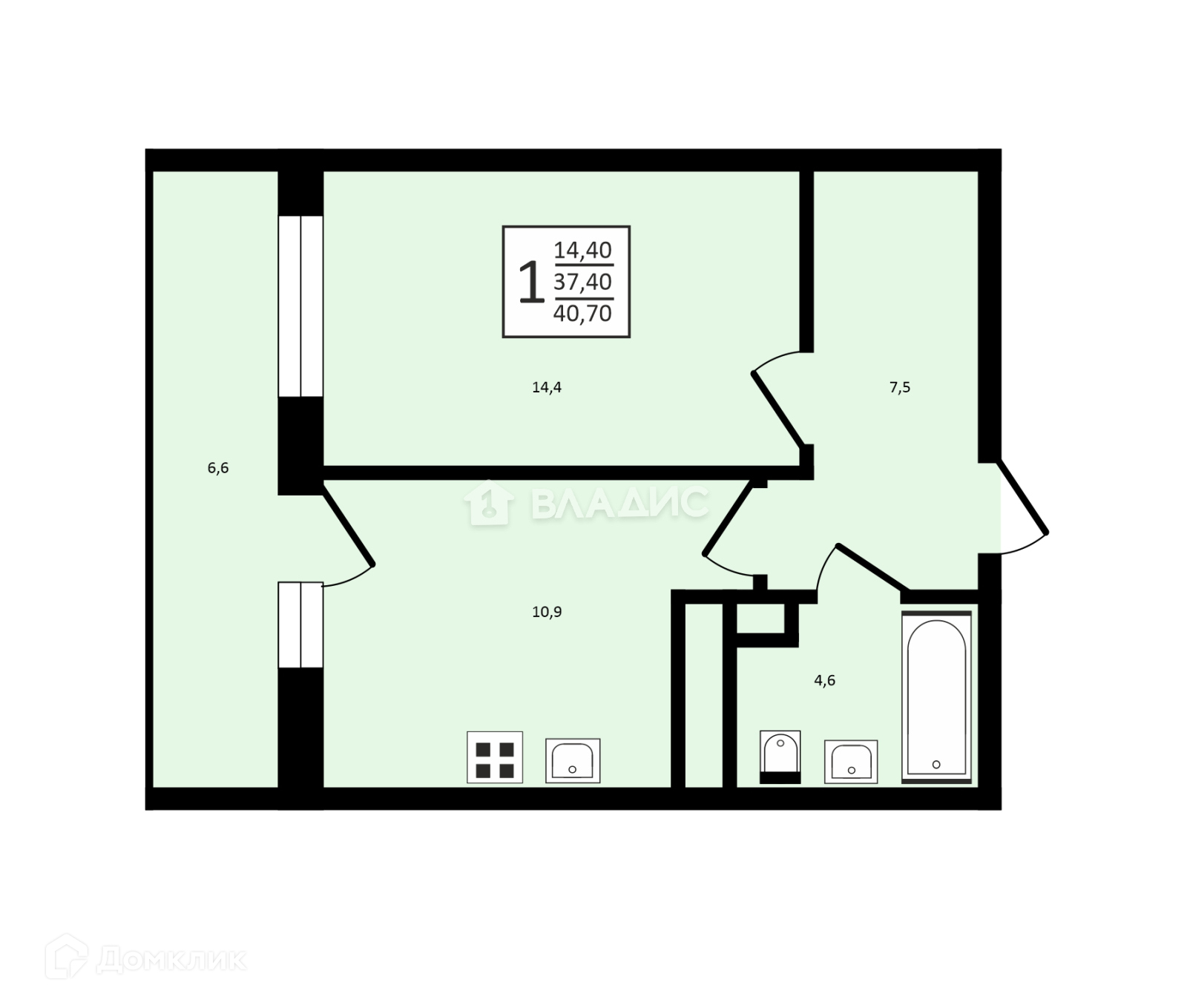 Функциональная планировка квартиры:кухня 10,9 кв.м. с выходом на большую лоджию 6,6 кв.м., комната 14,4 кв.м., совмещенный санузел 4,6 кв.м., прихожая 7,5 кв.м.