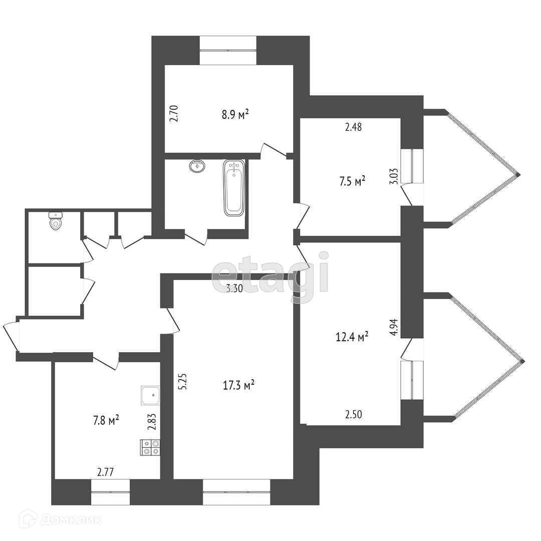 4Х-комнатная квартира улучшенной планировки, общей площадью - 78,1 м2 на 3-ем этаже в кирпичном доме. В квартире есть два раздельных санузла, две большие эркерные лоджии с панорамными окнами, большая прихожая, кухня - 7,8 м2, комнаты - 17, 12, 8 и 9 м2, гардеробная.