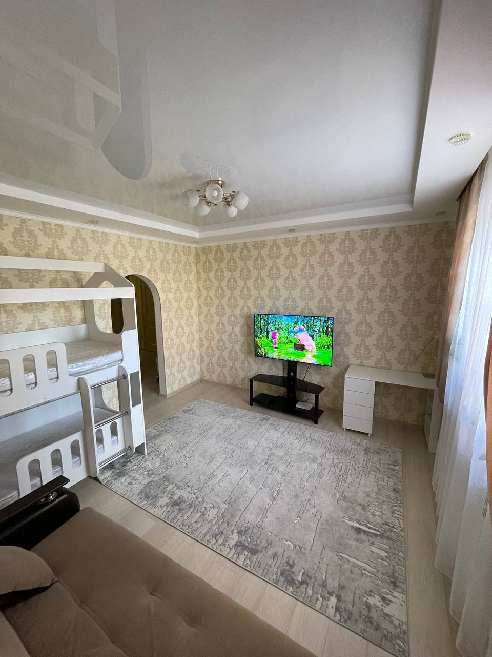 Остается встроенный кухонный гарнитур, два шкафа и при желании можно оставить двухэтажную кровать.