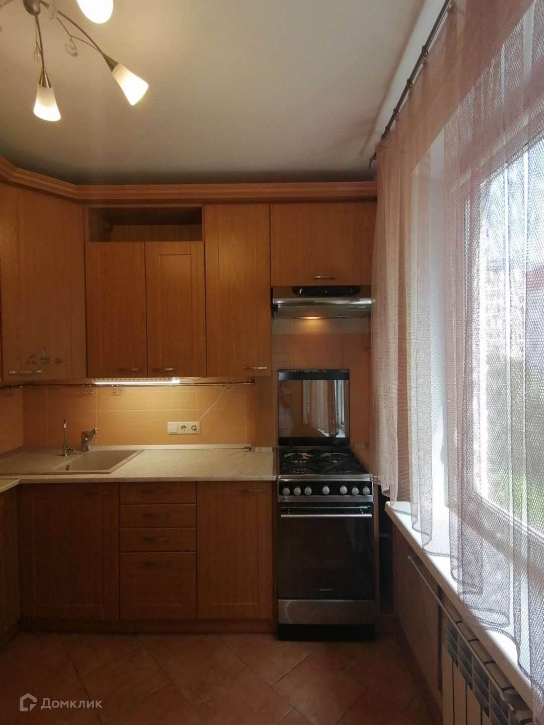 На кухне  остаётся кухонный гарнитур с вытяжкой и плитой.