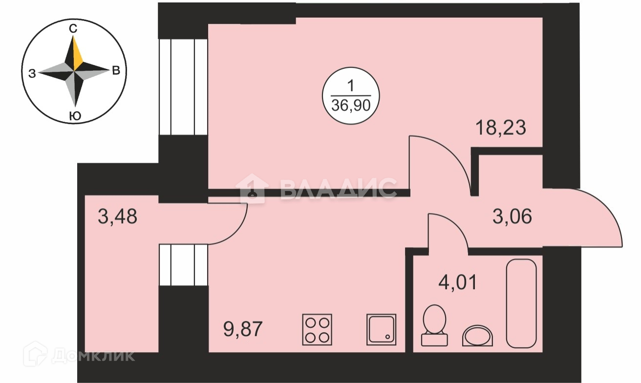 Жилая площадь 18.4 м2