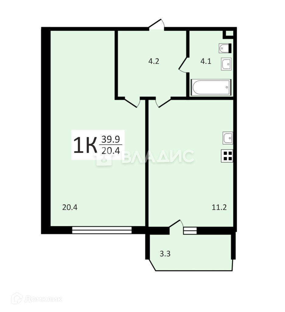 Жилая площадь 20.4 м2
