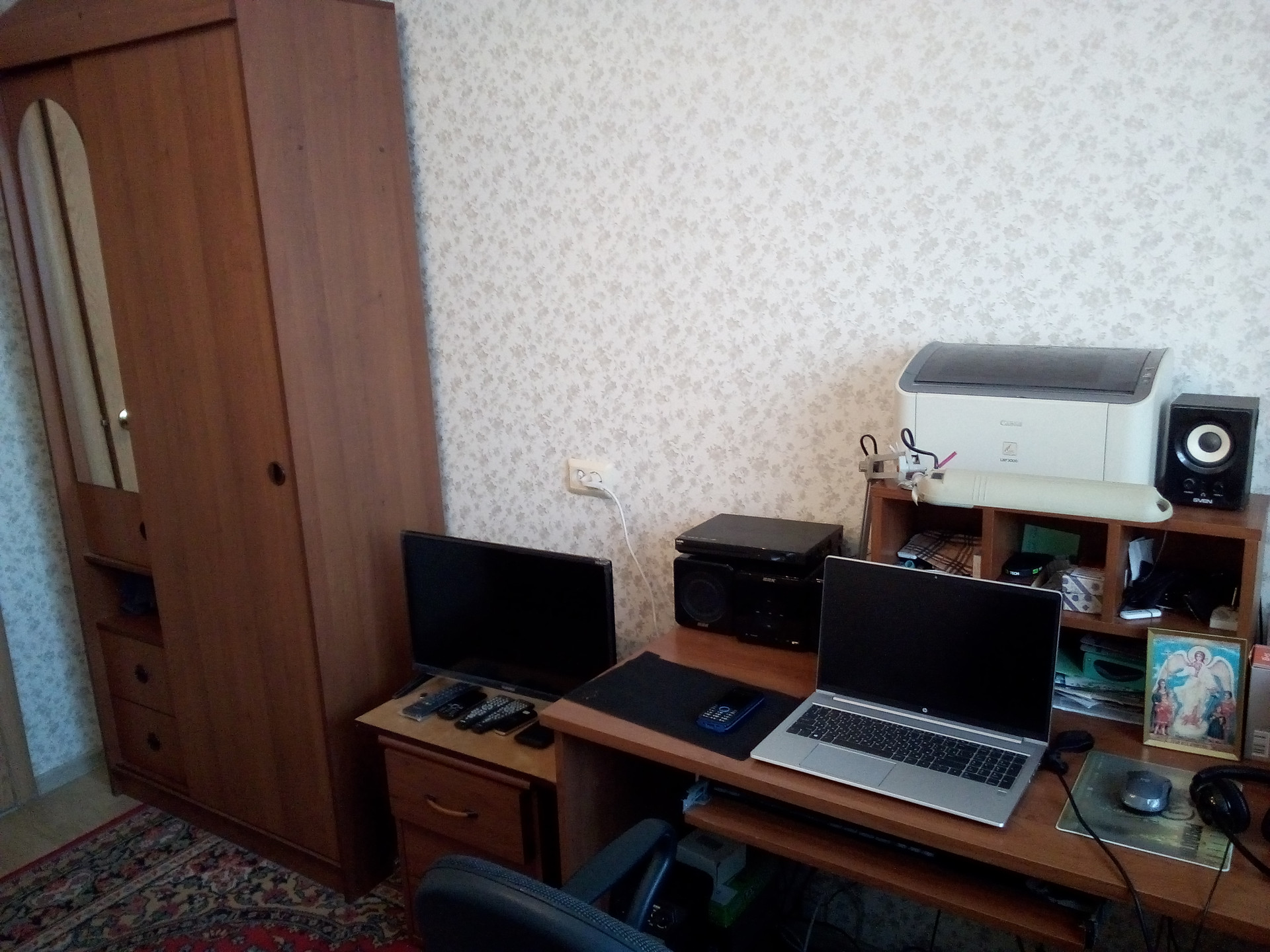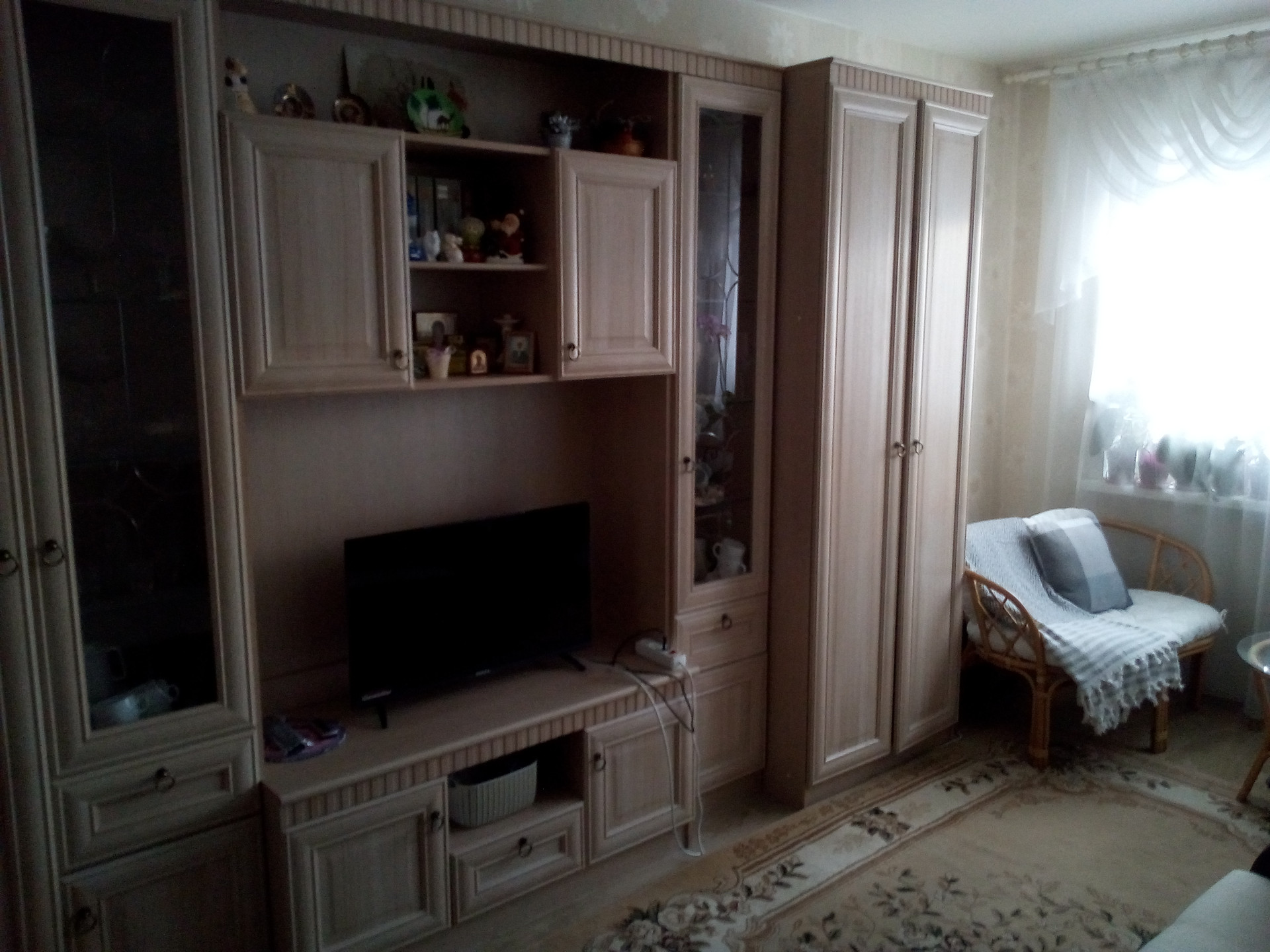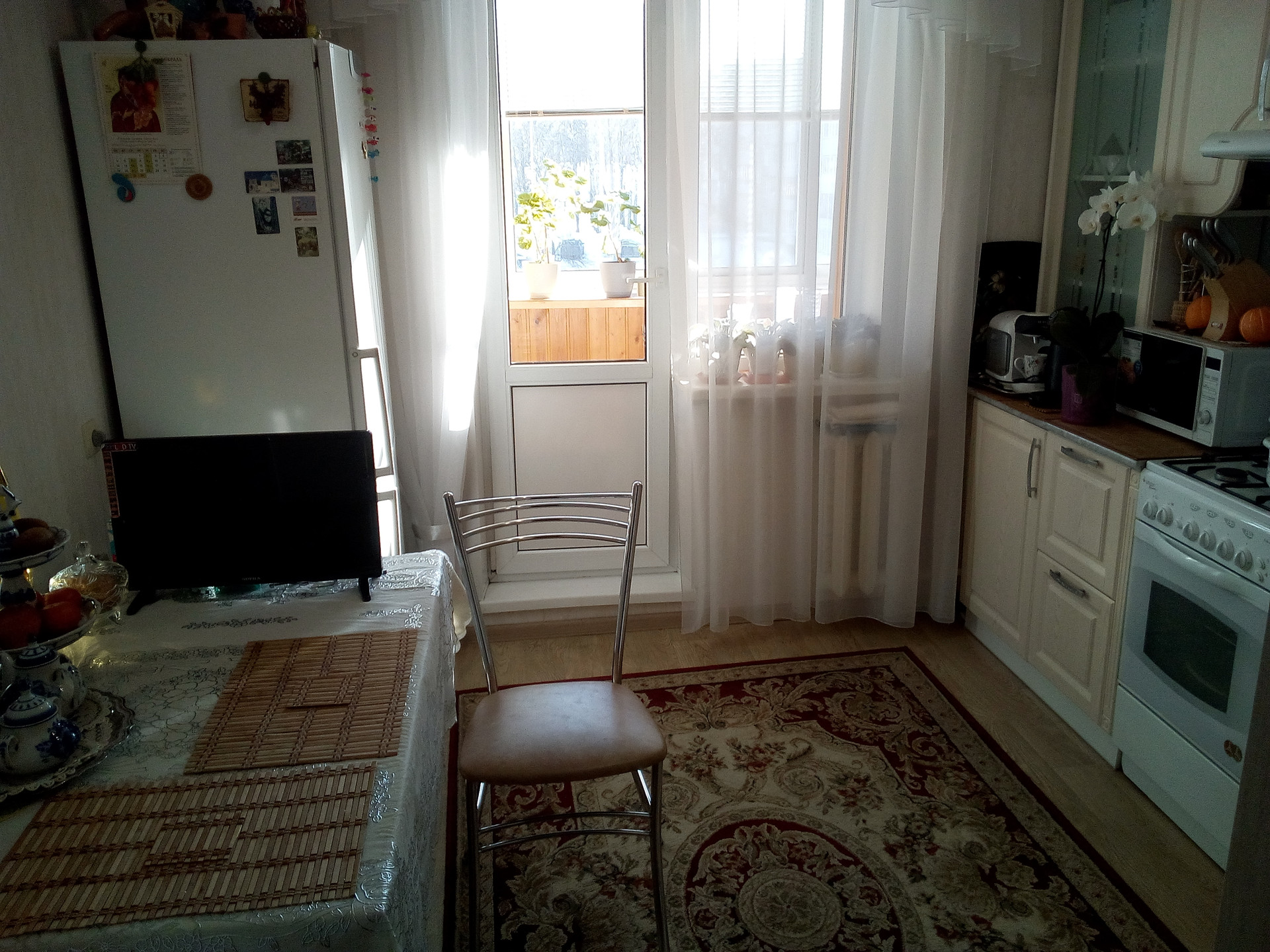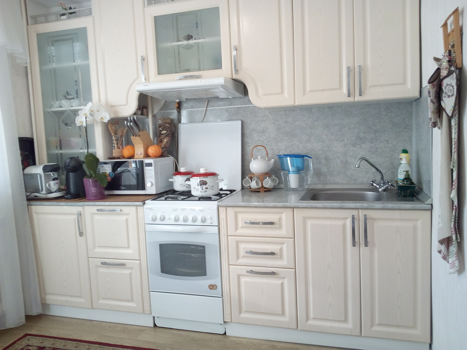 Остается: кухонный гарнитур со встроенной газовой плитой, вытяжкой.