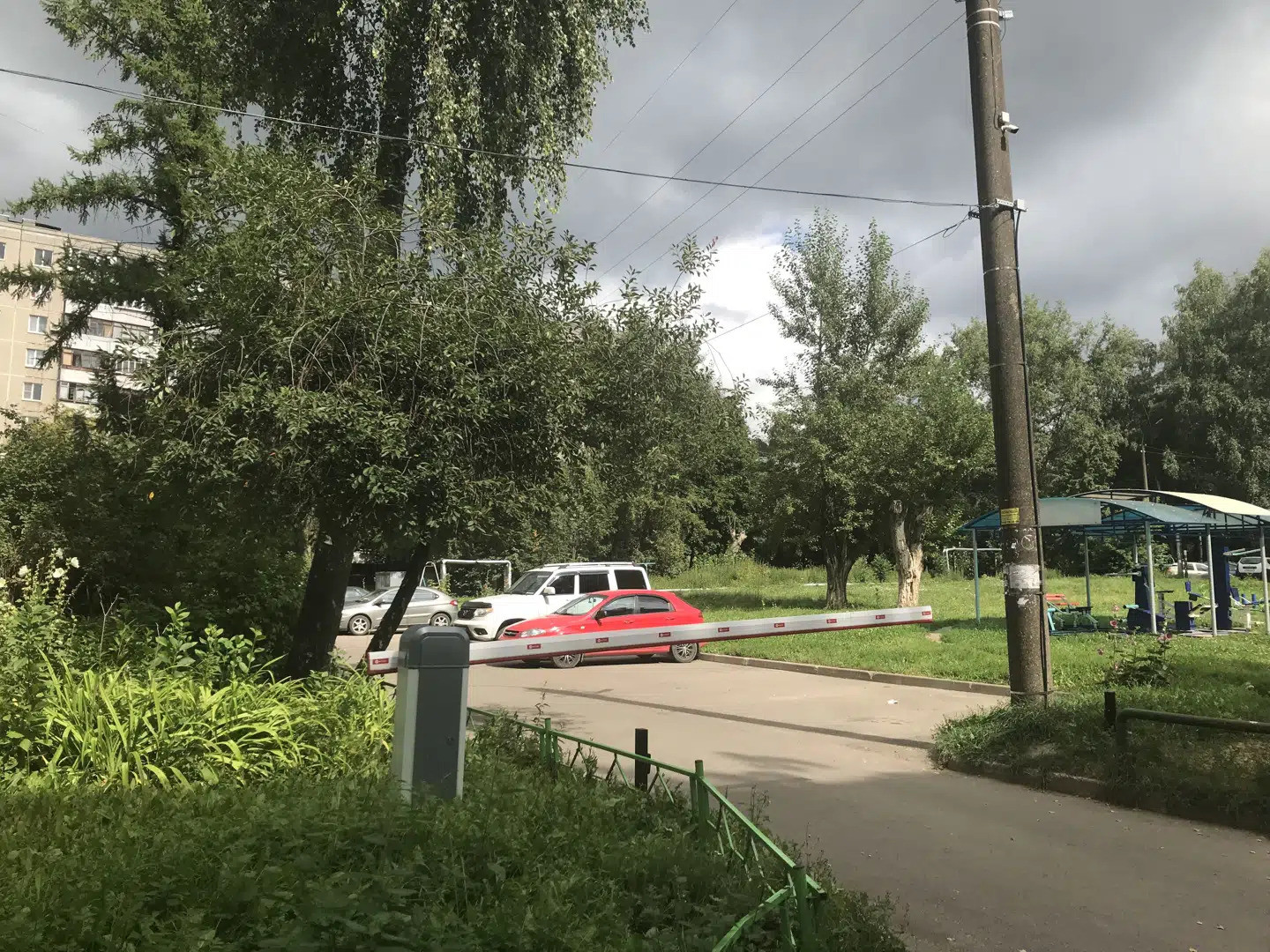 Во дворе дома установлен шлагбаум, свободная парковка, место всем хватает,установлено видеонаблюдение по периметру.
