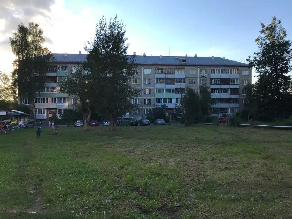 Большой зеленый двор с детской площадкой.