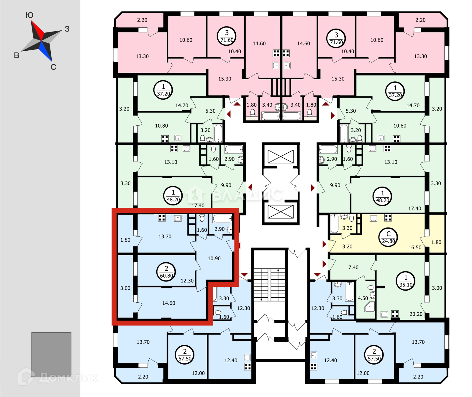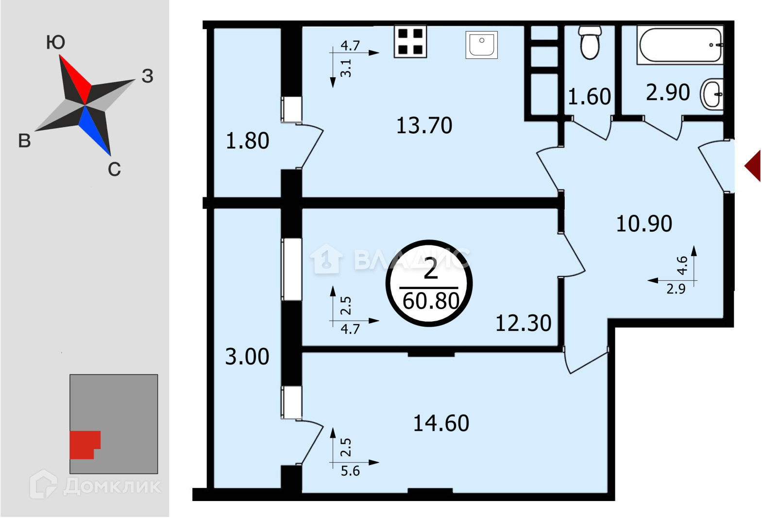 Общая площадь 60.8 м2