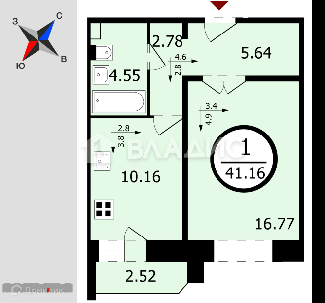 Общая площадь 40.7 м2