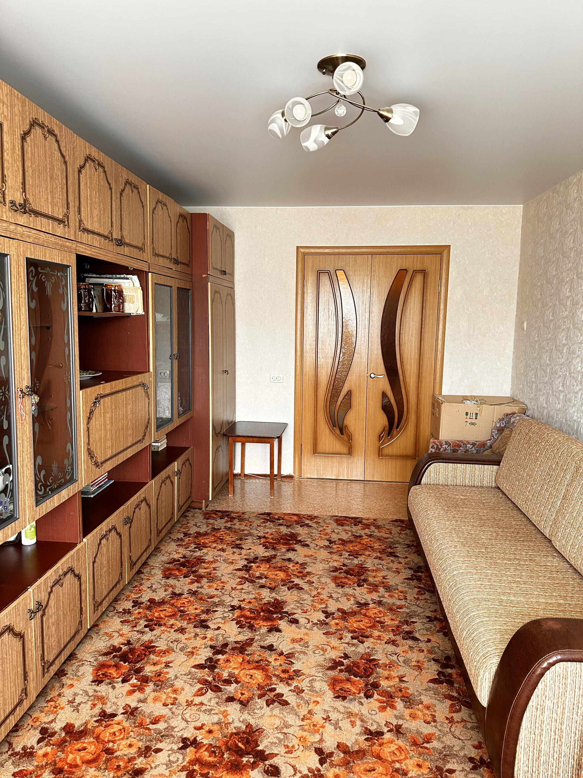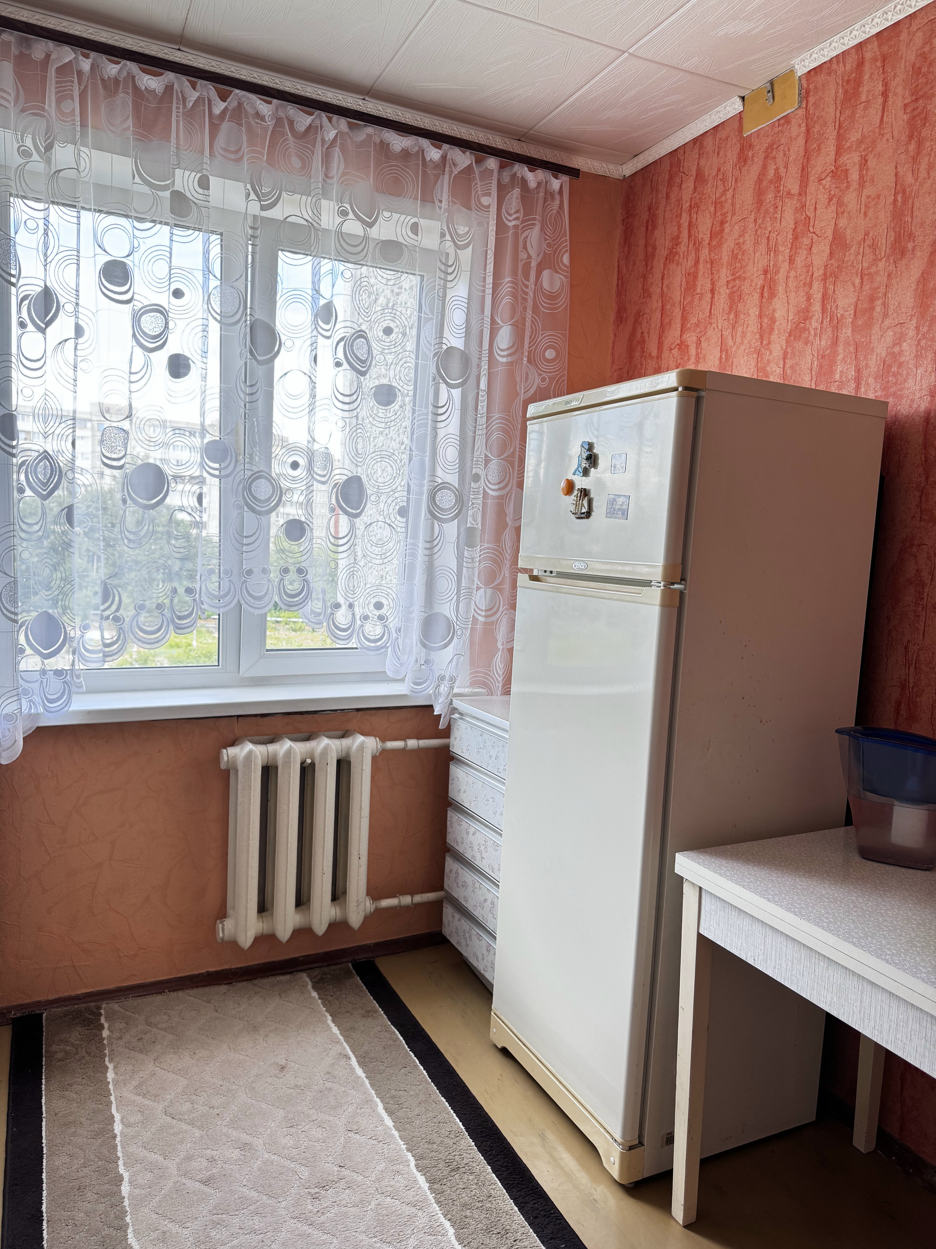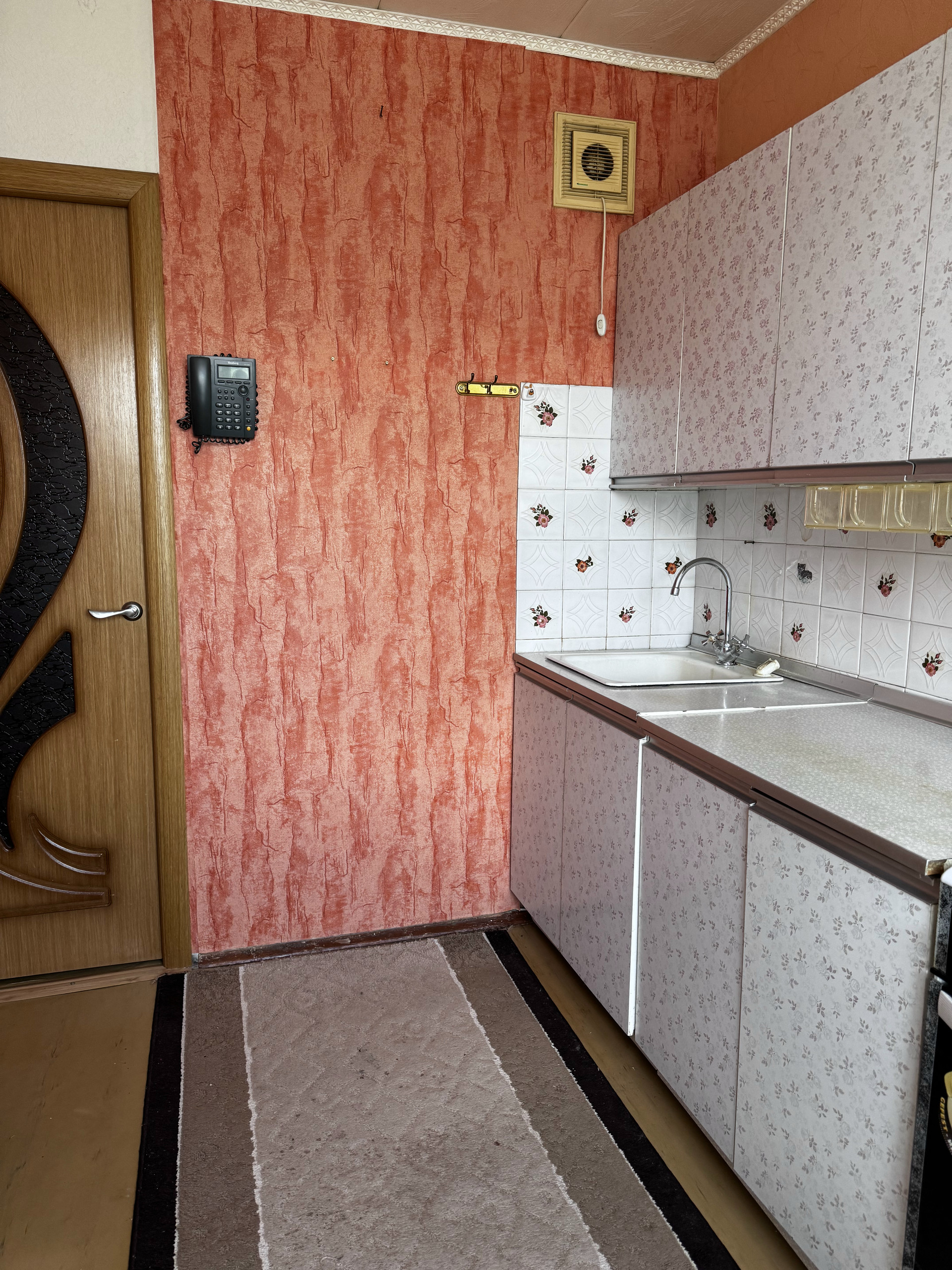 Кухня оборудована автоматической плитой Gefest с автоподжигом и советским гарнитуром, ожидающим вашего креативного обновления.