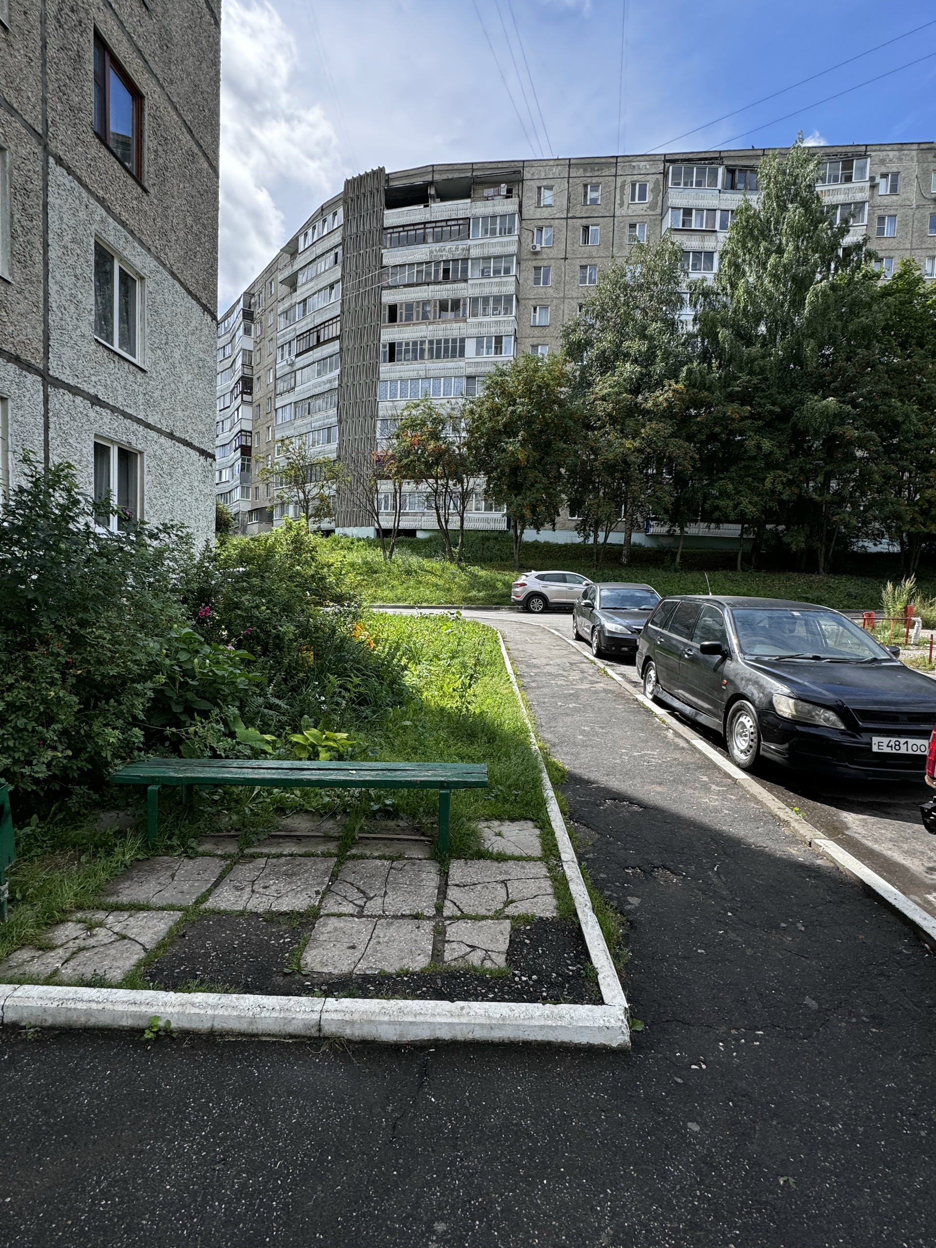 Детская площадка и зоны для спорта в зелёном дворе. Достаточное количество парковочных мест у дома.