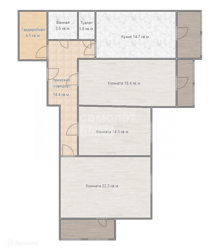 Квартира улучшенной планировки, комнаты изолированные площадью 22,3 кв.м., 14.3 кв.м. и 18.4 кв.м., кухня площадью 14.7 квадратов.